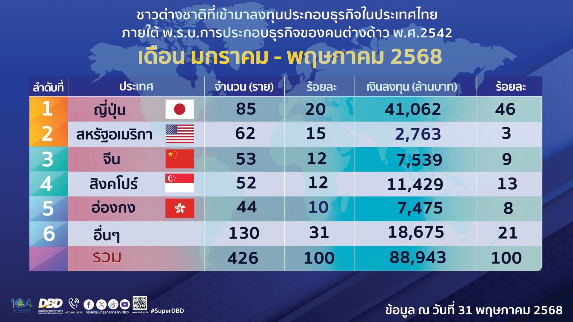 ทั้งนี้ เฉพาะเดือนพฤษภาคม 2568 มีการอนุญาตให้คนต่างชาติประกอบธุรกิจในประเทศไทย 63 ราย เป็นการลงทุนผ่านช่องทางการขอรับใบอนุญาตประกอบธุรกิจของคนต่างด้าว 18 ราย และการขอหนังสือรับรองการประกอบธุรกิจของคนต่างด้าว (ผ่านช่องทางการลงทุนตามกฎหมายว่าด้วยการส่งเสริมการลงทุน หรือได้รับอนุญาตตามกฎหมายว่าด้วยการนิคมอุตสาหกรรมแห่งประเทศไทย และการใช้สิทธิตามสนธิสัญญาหรือความตกลงระหว่างประเทศ) 45 ราย เงินลงทุนรวมทั้งสิ้น 31,083 ล้านบาท ส่วนใหญ่เป็นคนต่างชาติจาก ญี่ปุ่น สหรัฐอเมริกา และจีน ตามลำดับ มีการจ้างงานคนไทย 244 คน