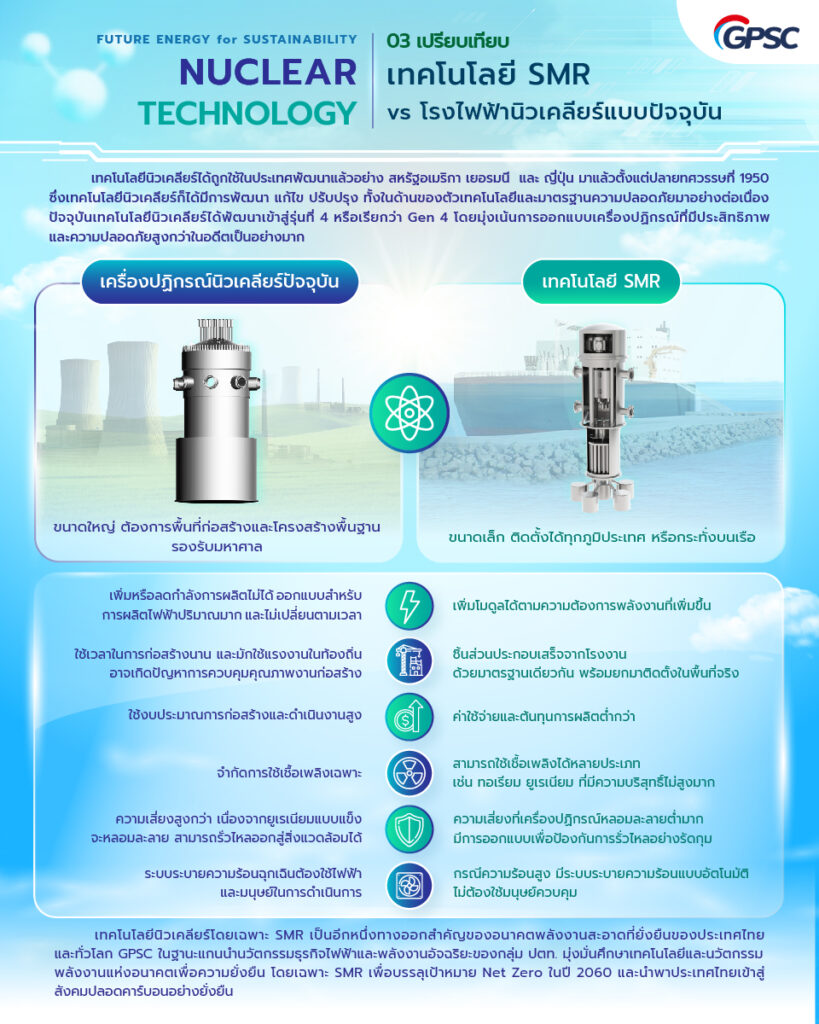 สำหรับเทคโนโลยี SMR ที่ GPSC กำลังศึกษาพัฒนาอยู่ เป็นนวัตกรรมพลังงานสะอาดยุคใหม่จากเทคโนโลยีปฏิกรณ์นิวเคลียร์รุ่นที่ 4 (Generation IV หรือ Gen IV) ที่จะช่วยยกระดับศักยภาพการแข่งขันของภาคอุตสาหกรรมไทย ด้วยคุณสมบัติเด่นที่สำคัญ 3 ประการ ได้แก่ สามารถผลิตพลังงานได้อย่างมีเสถียรภาพ ความปลอดภัยสูง และเป็นมิตรต่อสิ่งแวดล้อม เนื่องจากออกแบบเป็นโรงไฟฟ้าขนาดเล็ก กำลังการผลิต 100-300 เมกะวัตต์ต่อหน่วย ส่งผลให้มีระยะเวลาการก่อสร้างที่รวดเร็ว สามารถผลิตแบบโมดูลสำเร็จรูปจากโรงงาน และตอบโจทย์อุตสาหกรรมที่สามารถจ่ายทั้งไฟฟ้าและไอน้ำได้อย่างต่อเนื่อง ต่างจากพลังงานหมุนเวียนทั่วไปที่ผลิตได้เฉพาะช่วง ในส่วนกระบวนการผลิตไฟฟ้า ใช้แท่งเชื้อเพลิงยูเรเนียมความเข้มข้นต่ำ ร่วมกับระบบระบายความร้อนด้วยเกลือหลอมเหลว (Molten Salt Technology) ลดความเสี่ยงด้วยระบบความปลอดภัยแบบพาสซีฟ (Passive Safety System) ที่อาศัยหลักธรรมชาติในการลดความร้อนจากแท่งเชื้อเพลิงโดยอัตโนมัติในกรณีฉุกเฉิน อีกทั้งไม่มีการปล่อยคาร์บอนไดออกไซด์ระหว่างกระบวนการผลิตไฟฟ้า