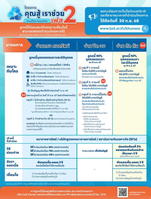 นางสาวสุวรรณี เจษฎาศักดิ์ ผู้ช่วยผู้ว่าการ สายกำกับสถาบันการเงิน ธนาคารแห่งประเทศไทย (ธปท.) เปิดเผย ว่า ภายใต้เศรษฐกิจที่มีความไม่แน่นอนสูง ยังมีลูกหนี้กลุ่มเปราะบางจำนวนมากที่มีปัญหาในการชำระหนี้ และพบว่าลูกหนี้ยังให้ความสนใจเข้าร่วมโครงการอย่างต่อเนื่อง แต่บางส่วนไม่สามารถเข้าร่วมได้เนื่องจากคุณสมบัติไม่เป็นไปตามเงื่อนไขที่กำหนด กระทรวงการคลัง สศช. ธปท. ธนาคารพาณิชย์ สถาบันการเงินเฉพาะกิจ รวมถึงผู้ประกอบธุรกิจ non-bank ที่เป็นบริษัทในกลุ่มธุรกิจทางการเงินของธนาคารพาณิชย์ เห็นควรขยายระยะเวลาลงทะเบียนเข้าร่วมโครงการคุณสู้เราช่วยเฟส 1 (เดิมสิ้นสุด 30 มิ.ย.68) และให้ความช่วยเหลือเพิ่มเติม ภายใต้โครงการ “คุณสู้ เราช่วย” เฟส 2 โดยยังคงยึดหลักการสำคัญเช่นเดียวกับโครงการเฟส 1 ได้แก่ การช่วยเหลือลูกหนี้กลุ่มเปราะบางที่มีโอกาสรอดให้สามารถฟื้นตัวกลับมาชำระหนี้ได้ตามปกติ ทั้งนี้มาตรการดังกล่าวเป็นมาตรการชั่วคราว พร้อมกำหนดแนวทางป้องกันมิให้ลูกหนี้เสียวินัยในการชำระหนี้ควบคู่ไปด้วย โดยยังคงพิจารณาคุณสมบัติของลูกหนี้ไว้ที่ 31 ต.ค. 67 เช่นเดียวกับเฟส 1 โดยโครงการ คุณสู้เราช่วยเฟส 2 ประมาณการลูกหนี้ที่มีคุณสมบัติเข้าข่ายประมาณ 1.8 ล้านราย จำนวน 2 ล้านบัญชี ยอดหนี้ 3.1 แสนล้านบาท