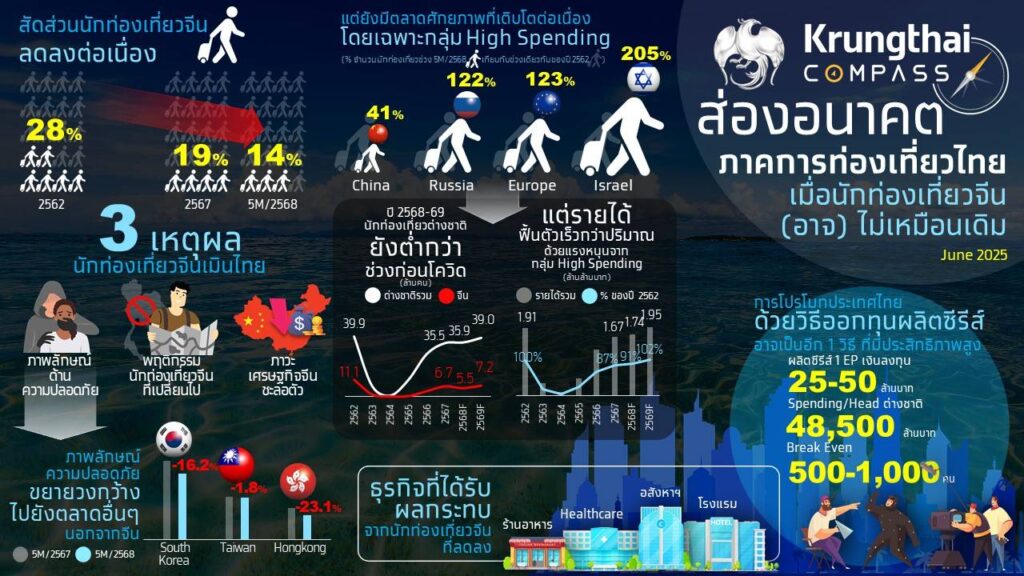 ศูนย์วิจัย Krungthai COMPASS ธนาคารกรุงไทย เปิดเผยบทวิเคราะห์แนวโน้มภาคการท่องเที่ยวไทยในระยะต่อไป โดยระบุว่า จำนวนนักท่องเที่ยวจีน ซึ่งเป็นตลาดหลักของไทยในอดีต ยังฟื้นตัวไม่เต็มที่ โดยมีปัจจัยกดดันจากเศรษฐกิจภายในประเทศจีนเอง รวมถึงข้อจำกัดด้านเที่ยวบินตรงและการออกวีซ่าที่ใช้เวลานาน ทำให้นักท่องเที่ยวจีนจำนวนมากเลือกเดินทางไปยังประเทศอื่นแทน แม้ตัวเลขนักท่องเที่ยวจีนจะยังต่ำกว่าระดับก่อนโควิด แต่รายได้จากนักท่องเที่ยวจีนกลุ่มคุณภาพที่ยังเดินทางเข้ามานั้นยังถือว่ามีศักยภาพในการกระตุ้นเศรษฐกิจ โดยเฉพาะกลุ่มที่นิยมอาหารไทยและท่องเที่ยวเชิงวัฒนธรรม