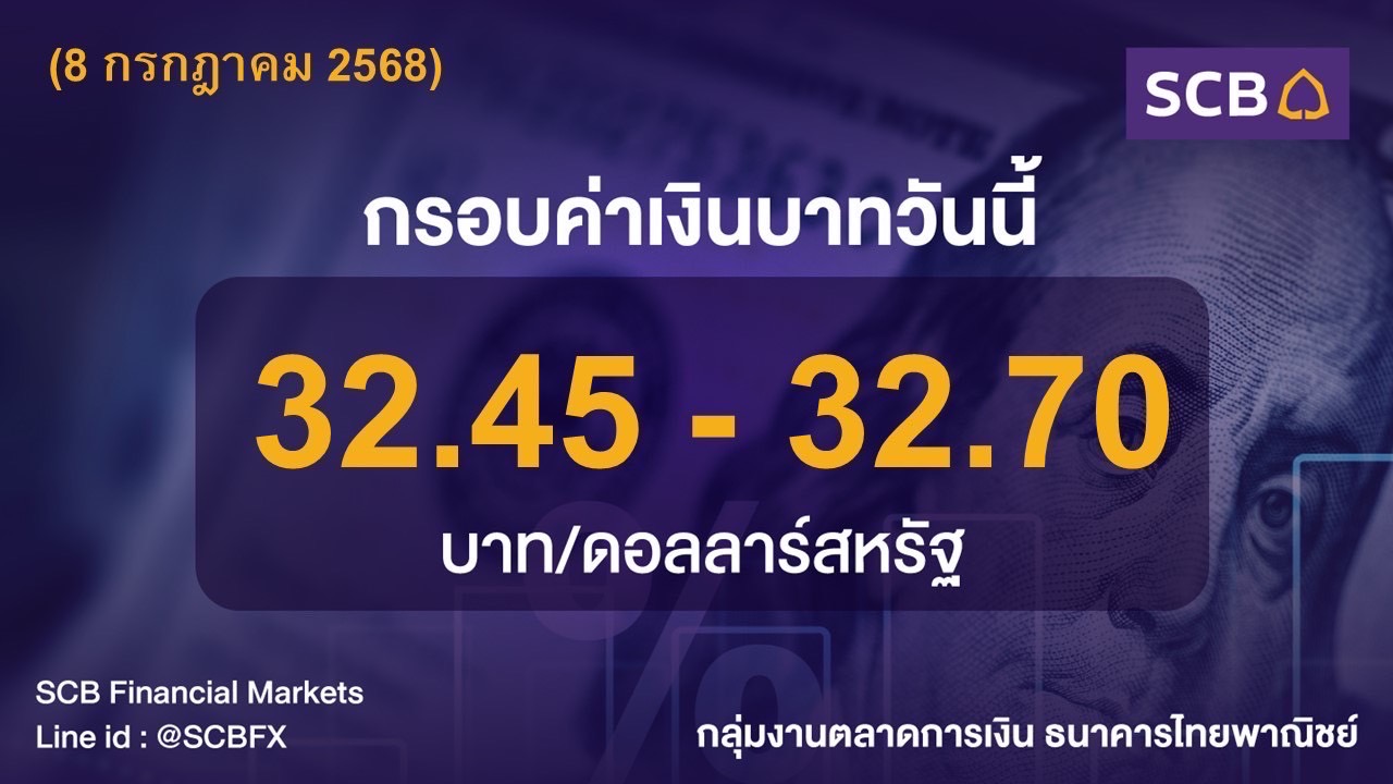 กลุ่มการตลาดการเงิน ธนาคารไทยพาณิชย์ (SCB Financial Markets) เผยเงินบาทอ่อนค่าขึ้นตั้งแต่วันก่อน หลังนายโดนัลด์ ทรัมป์ ประธานาธิบดีสหรัฐฯ ประกาศว่าจะเรียกเก็บภาษีนำเข้าเพิ่มเติมอีก 10% กับประเทศใดก็ตามที่สนับสนุนนโยบายของกลุ่มBRICS และจะเรียกเก็บภาษีจากเกาหลีใต้และญี่ปุ่นเพิ่มอีก 25% ขณะที่ในช่วงข้ามคืนทรัมป์ ประกาศขึ้นภาษีตอบโต้ต่อไทยที่ 36% เท่ากับเมื่อเดือนเมษายน แต่เงินบาทยังทรงตัว สำหรับเงินเฟ้อไทยเดือนมิถุนายน 2568 ออกมาที่ -0.25% ติดลบ 3 เดือนติดต่อกันจากราคาพลังงานและอาหารสดที่ลดลง ส่วนเงินเฟ้อพื้นฐานอยู่ที่ 1.06%. ประเมินค่าเงินบาทวันนี้เคลื่อนไหวในกรอบ 32.45-32.70 บาท/ดอลลาร์