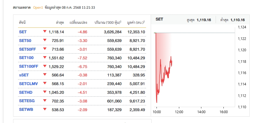 ผู้สื่อข่าวรายงานว่า หุ้นไทยเช้านี้ เปิดตลาดร่วงกว่า 10 จุด แต่หลังจากนั้นหุ้นไทยขยับดีขึ้น โดยเมื่อเวลา 11.21 น. หุ้นไทยลดลง 4.86 จุด ดัชนีเคลื่อนไหว 1,118 จุด หลังนายโดนัลด์ ทรัมป์ ประธานาธิบดีสหรัฐ ได้ส่งจดหมายแจ้ง 14 ประเทศ โดยในส่วนไทยคงอัตราเรียกเก็บภาษีตอบโต้ 36% มีผล 1 ส.ค.นี้ โดยปีที่แล้วไทยเกินดุลสหรัฐมูลค่า 46,000 ล้านดอลลาร์ (ราว 1.48 ล้านล้านบาท)
