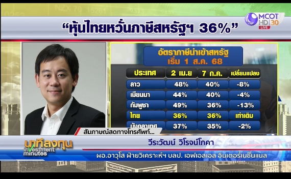 นายวีระวัฒน์ วิโรจน์โภคา ผอ.อาวุโส ฝ่ายวิเคราะห์ฯ บลป. เอฟเอสเอส อินเตอร์เนชั่นแนล กล่าวว่า ตัวเลขภาษีที่สหรัฐระบุจะเก็บจากไทยที่ 36 % สะท้อน คือ ดีลข้อเสนอของไทยยังไม่เป็นที่น่าพอใจ เป็นลักษณะที่เรียกร้องให้ไทยเสนอผลประโยชน์สหรัฐเพิ่มเติมแก่สหรัฐ ซึ่งน่ากังวลเมื่ออัตราภาษี ของไทยเมื่อเทียบกับคู่แข่ง เช่น เวียดนาม มาเลเซีย อินโดนีเซีย ไทยค่อนข้างสูงกว่า กระทบความสามารถด้านการแข่งขัน ก็เชื่อว่าเป็นกลยุทธ์สหรัฐที่ต้องการให้รัฐบาลไทยเสนอผลประโยชน์เพิ่มเติม เพื่อลดผลกระทบต่อการส่งออกของไทย ซึ่งหากอัตราภาษีไม่ลดลงเลย จะกระทบหลายกลุ่มหนักสุด คือ กลุ่มอาหาร อิเล็กทรอนิกส์ เกษตร ซึ่งคาดว่าไทยคงต้องเปิดนำเข้าเนื้อสัตว์ในอัตราภาษีที่ลดลง นอกจากนี้หากภาษีไทยสูงก็จะกระทบต่อการตัดสินใจเข้ามาตั้งโรงงานในไทยก็จะกระทบต่อ กลุ่มนิคมอุตสาหกรรมต่างๆ