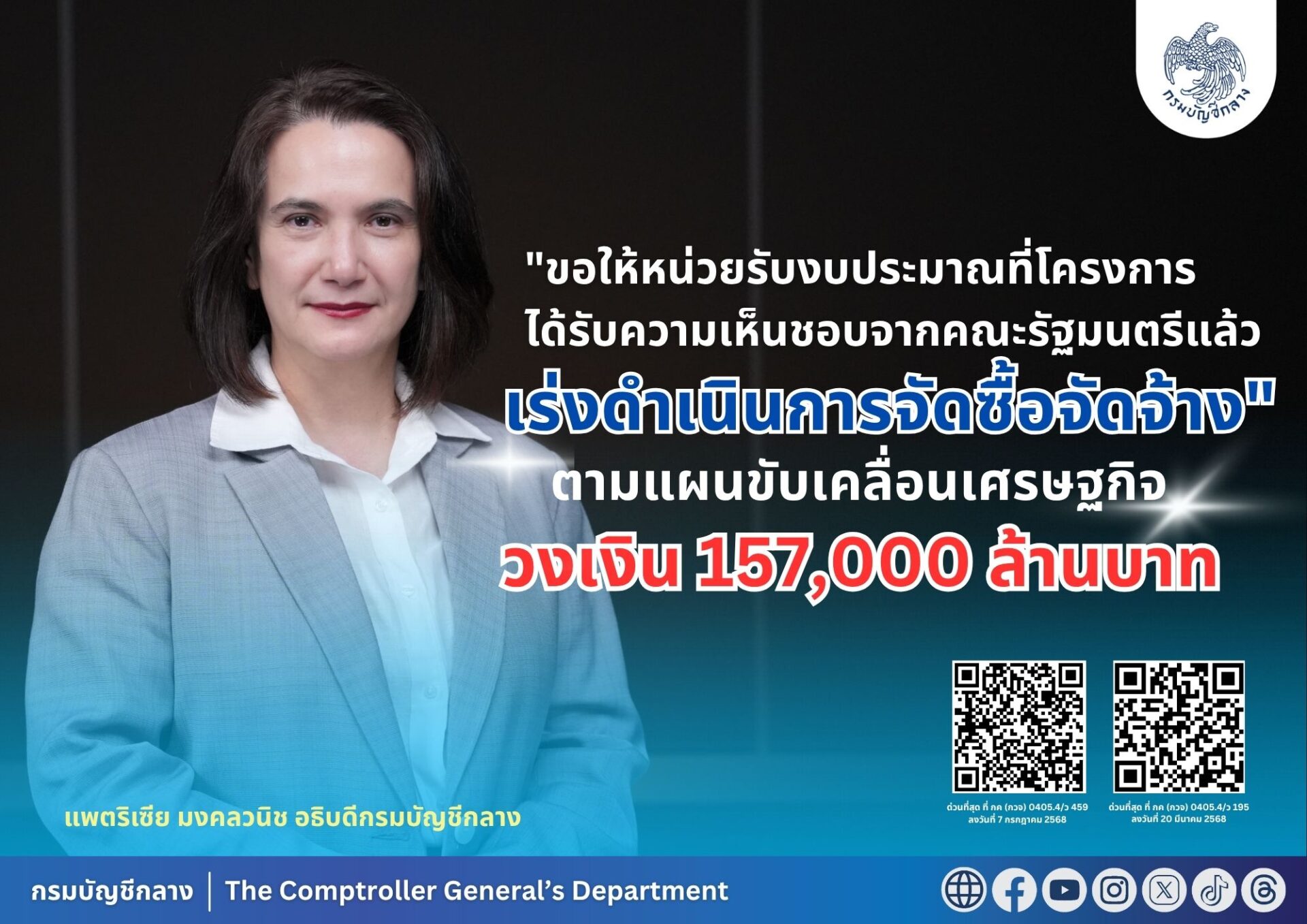 นางแพตริเซีย มงคลวนิช อธิบดีกรมบัญชีกลาง เปิดเผยว่า ตามที่คณะรัฐมนตรีได้เห็นชอบข้อเสนอโครงการ/รายการกระตุ้นเศรษฐกิจตามแผนการขับเคลื่อนเศรษฐกิจ ภายใต้กรอบวงเงิน 157,000 ล้านบาท และให้ส่วนราชการขอรับจัดสรรงบกลางปี 68 เพื่อการกระตุ้นเศรษฐกิจและสร้างความเข้มแข็งของระบบเศรษฐกิจ ดังนั้น เพื่อให้การจัดซื้อจัดจ้างเป็นไปอย่างรวดเร็ว