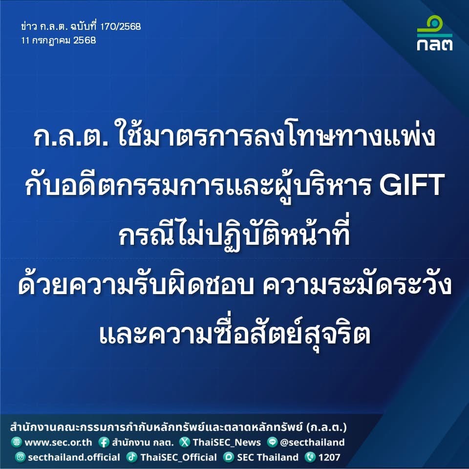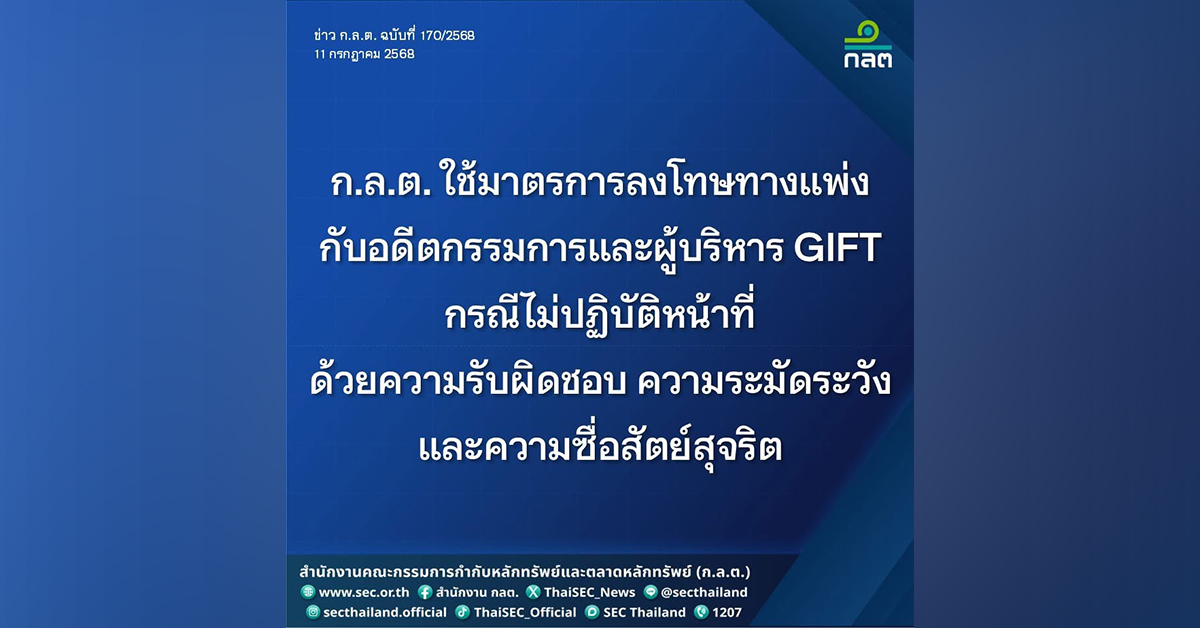 กรุงเทพฯ 11 ก.ค.- ก.ล.ต. ดำเนินคดีทางแพ่งกับ “พีรเจต สุวรรณนภาศรี” อดีตกรรมการและผู้บริหาร GIFT กรณีไม่ปฏิบัติหน้าที่ด้วยความรับผิดชอบ ความระมัดระวัง และความซื่อสัตย์สุจริต ปรับเงิน รวม 982,265 บาท ห้ามเป็นกรรมการหรือผู้บริหาร 30 เดือน