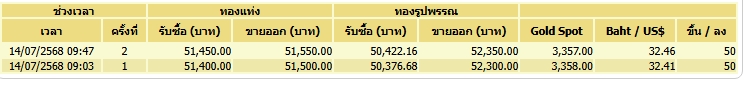 ส่วนราคาทองไทย เวลา 09.47 น. สมาคมค้าทองคำประกาศขยับขึ้น 2 ครั้งรวม 100 บาท โดย ราคาทองแท่งขายออก 51,550 บาท/บาททองคำ ทองสำเร็จรูปขายออกบาทละ 52,350 บาท / 511 สำนักข่าวไทย