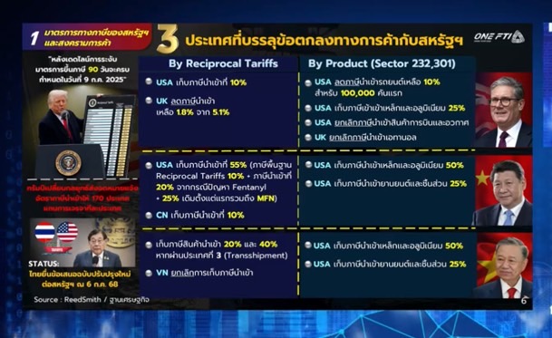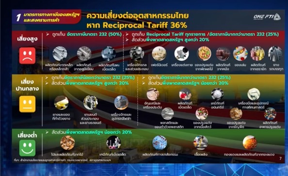 นายวิวรรธน์ เหมมณฑารพ รองประธานสภาอุตสาหกรรมแห่งประเทศไทย (ส.อ.ท.) กล่าวว่า หาก Reciprocal Tariff ยังคงอยู่ที่ 36% อุตสาหกรรมไทยจะได้รับผลกระทบเยอะมาก โดยเฉพาะอุตสาหกรรมเหล็กกล้า อะลูมิเนียม เสื้อผ้า เฟอร์นิเจอร์ และในช่วงครึ่งปีหลังส่งออกมีแนวโน้มแผ่วลง เนื่องจากสหรัฐเร่งนำเข้าสินค้า นอกจากนี้ปัญหา Chaina Flooding จะส่งผลกระทบต่อภาคอุตสาหกรรมการผลิตของไทย ดังนั้น ส.อ.ท.ได้เสนอรัฐเจรจาภาษีสหรัฐฯ โดยให้มีอัตราภาษี 2 ระดับ คือ ให้อัตราภาษี 40% ส่วนสินค้าที่คิด 36% ก็ให้กดต่ำลงมา หากสินค้าที่ผลิตในประเทศไทย เช่น WD (Western digital) หรือ ชิปต่างๆ ฮาร์ดดิสไดร์ ของบริษัทอเมริกาที่ผลิตในเมืองไทย รวมถึงภาคการเกษตรที่ผลิตในประเทศไทย สินค้า made in Thailand หรือที่มี Local content สูงๆ เหล่านี้ต้องเจรจาให้ได้อัตราภาษีที่ต่ำว่า 36% โดยอาจจะเหลือ 20% หรือ 25% ส่วนสินค้าที่มองว่าไทยเป็นทางผ่าน สินค้าจากจีนที่ทางที่นำมาประกอบในไทย (Transshipment) ก็ให้คิดอัตราภาษี 40% เท่าเวียดนาม ซึ่ง ส.อ.ท. ต้องการให้เป็นการคิดอัตราภาษี 2 ระดับ ซึ่ไทยจะได้ประโยชน์ในระยะยาวมากกว่าการยกเลิกภาษีสินค้านำเข้าจากสหรัฐ พร้อมระบุประเทศไทยต้องเร่งเปลี่ยนอุตสาหกรรมยานยนต์ ICE เป็น EV Hybrid โดยรัฐบาลต้องปักธงให้ชัดเจน และต้องใส่งบประมาณเข้ามาโดยตรง. -517-สำนักข่าวไทย