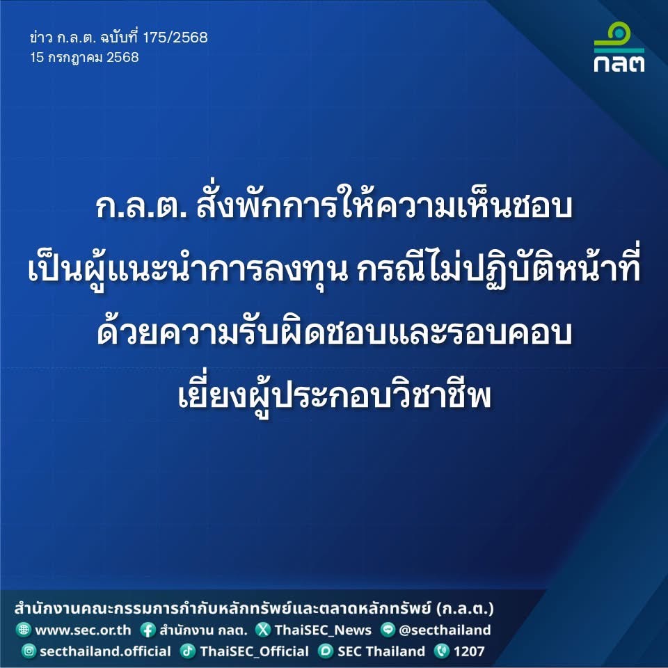 การกระทำของนางกิ่งกาญจน์ ดังกล่าวเข้าข่ายเป็นการไม่ปฏิบัติหน้าที่ด้วยความรับผิดชอบและรอบคอบเยี่ยงผู้ประกอบวิชาชีพ ซึ่งเป็นเป็นลักษณะต้องห้ามของบุคลากรในตลาดทุนตามประกาศคณะกรรมการกำกับตลาดทุน* ก.ล.ต. จึงพักการให้ความเห็นชอบเป็นผู้แนะนำการลงทุนตราสารซับซ้อนประเภท 1** ของนางกิ่งกาญจน์เป็นเวลา 7 เดือน 15 วัน นับตั้งแต่วันที่ 16 กรกฎาคม 2568