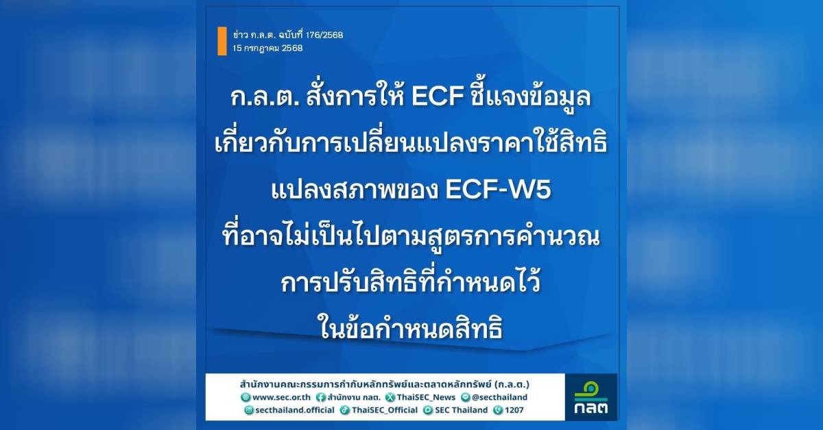 ก.ล.ต. จึงอาศัยอำนาจตามมาตรา 58 แห่งพระราชบัญญัติหลักทรัพย์และตลาดหลักทรัพย์ พ.ศ. 2535 ให้ ECF ชี้แจงข้อเท็จจริงเกี่ยวกับการที่ ECF ระบุว่าได้พิจารณาหารือร่วมกับนายทะเบียนบริษัทมหาชนอย่างใกล้ชิดก่อนจะดำเนินการปรับราคาใช้สิทธิดังกล่าว ต่อ ก.ล.ต. ภายในวันที่ 18 กรกฎาคม 2568 พร้อมให้เปิดเผยข้อมูลดังกล่าวต่อสาธารณชนผ่านระบบ SETLink ด้วย.-516.-สำนักข่าวไทย