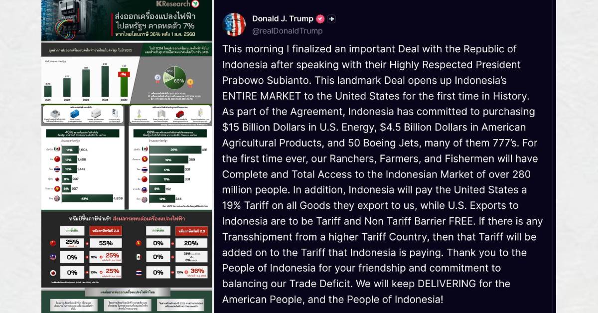 หลังจากอินโดนีเซียเป็นประเทศที่ 2 ในอาเซียน ที่นายโดนัลด์ ทรัมป์ ประธานาธิบดีสหรัฐ ประกาศว่าเจราจาภาษีสำเร็จ จากที่ก่อนหน้านี้เจรจากับเวียดนามเรียบร้อยไปแล้ว โดยฝ่ายสหรัฐลดภาษีต่างตอบโต้ให้อินโดนีเซียเหลือ 19% จาก 32% ส่วนสหรัฐสามารถส่งออกเข้าตลาดอินโดนีเซียโดยปลอดภาษี ภายใต้ข้อตกลงนี้ อินโดนีเซียจะซื้อสินค้าสหรัฐ ประกอบด้วยพลังงาน 1.5 หมื่นล้านดอลลาร์สหรัฐ, ผลิตภัณฑ์ทางการเกษตร 4.5 พันล้านดอลลาร์ฯ และซื้อเครื่องบินโบอิ้งอีก 50 ลำ โดยมีจำนวนมากที่เป็นโบอิ้ง 777 อย่างไรก็ตาม หากมีสินค้าจากประเทศอื่น ๆ มาสวมสิทธิ์ภาษีของอินโดนีเซีย สหรัฐจะเก็บภาษีบวกเพิ่มตามอัตราที่กำหนดจากประเทศที่สวมสิทธิ์ บวกกับอัตราภาษีที่อินโดนีเซียจะต้องจ่าย