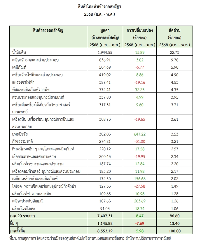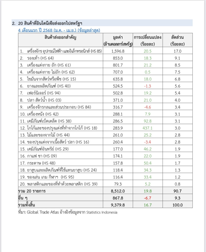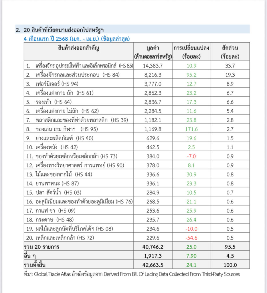 ในขณะที่ไทยนำเข้าสินค้าจากจีน 40,501 ล้านดอลลาร์ เพิ่มขึ้น 29.98% โดย 5 อันดับแรกที่นำเข้าได้แก่ เครื่องจักรไฟฟ้า, เครื่องจักรกลและส่วนประกอบ,เครื่องใช้ไฟฟ้าในบ้าน,เคมีภัณฑ์,เครื่องคอมพิวเตอร์ อุปกรณ์ และส่วนประกอบ โดยสินค้าไทยที่ส่งออกไปจีน มูลค่า17,208 ล้านดอลลาร์ฯ เพิ่มขึ้น 17.87% โดย 5 อันดับแรกได้แก่ เครื่องคอมพิวเตอร์และส่วนประกอบ,ผลไม้,ผลิตภัณฑ์ยาง,ยางพารา,เม็ดพลาสติก ,ผลิตภัณฑ์มันสำปะหลัง ในขณะที่ เดือนมกราคม-เมษายน 68 หากไปดูสินค้าที่อินโดนีเซีย ส่งออกไปสหรัฐ รวม 20 รายการแรก มีมูลค่ารวม 9,379 ล้านดอลลาร์ ขยายตัว 16.7% ส่วนสินค้าที่เวียดนามส่งออกไปสหรัฐ รวม 42,663 ล้านดอลลาร์ ขยายตัว 24.1%. -511-สำนักข่าวไทย