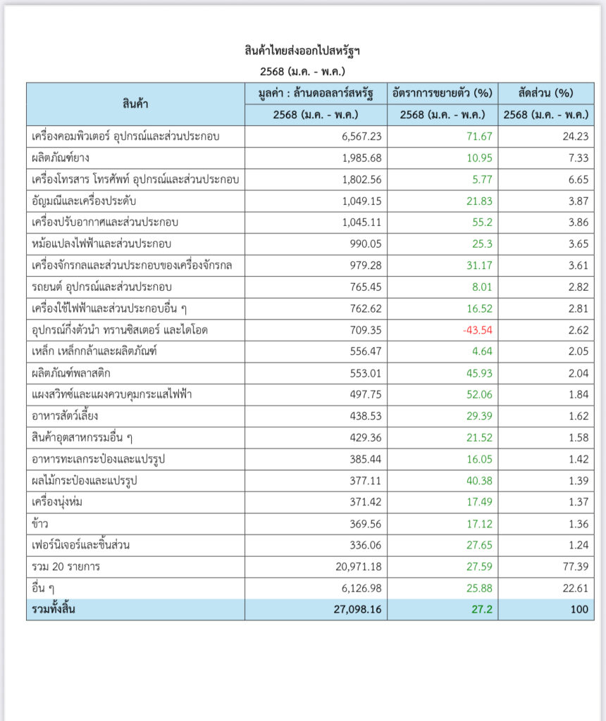 ด้านสำนักงานนโยบายและยุทธศาสตร์การค้า (สนค.) กระทรวงพาณิชย์ เปิดเผยข้อมูลการค้าระหว่างประเทศ เดือน มกราคม-พฤษภาคม 2568 ไทยส่งออกไปสหรัฐ 27,098 ล้านดอลลาร์ ขยายตัว 27.2% โดยสินค้าอันดับแรกๆ คือ เครื่องคอมพิวเตอร์ อุปกรณ์และส่วนประกอบ ,ผลิตภัณฑ์ยาง,เครื่องโทรสาร โทรศัพท์ อุปกรณ์และส่วนประกอบ, อัญมณีและเครื่องประกับ, หม้อแปลงไฟฟ้าและส่วนประกอบ ส่วนไทยนำเข้าจากสหรัฐ มูลค้า 8,553 ล้านดอลลาร์ เพิ่มขึ้น 5.98% โดยสินค้า 5 อันดับแรกนำเข้า ได้แก่ น้ำมันดิบ, เครื่องจักรและส่วนประกอบ, เคมีภัณฑ์, เครื่องจักรไฟฟ้าและส่วนประกอบ, แผงวงจรไฟฟ้า,พืชและผลิตภัณฑ์จากพืช
