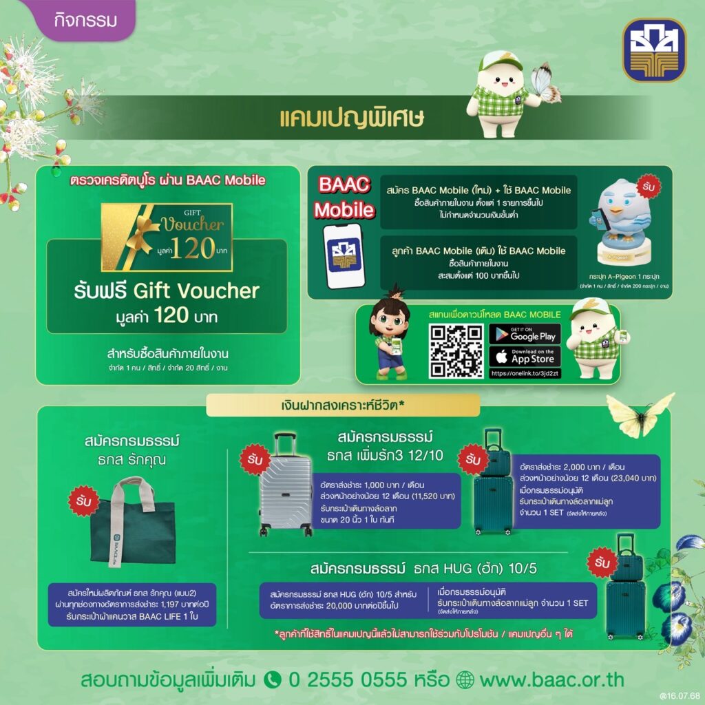 นอกจากนี้ ยังมีผลิตภัณฑ์เงินฝากสงเคราะห์ชีวิต ซึ่งถือเป็นทางเลือกในการออมเงินที่มาพร้อมความคุ้มครองและสิทธิประโยชน์ในการลดหย่อนภาษี ที่คัดโปรโมชันพิเศษมานำเสนอ เพื่อรับของสมนาคุณ ทั้งกระเป๋าเดินทาง กระเป๋าเดินทางแม่ลูก จำนวน 1 เซต (ประกอบด้วย 2 ใบ คือ กระเป๋าเดินทาง 4 ล้อลาก ขนาด 20 นิ้ว และกระเป๋าเดินทางแบบหิ้ว ขนาด 14 นิ้ว) และรับกระเป๋าผ้าแคนวาส BAAC Life เป็นต้น ในด้าน สินเชื่อ ธ.ก.ส. นำผลิตภัณฑ์สินเชื่อที่หลากหลาย ทั้งในและนอกภาคเกษตรมาให้คำแนะนำแก่ผู้ที่สนใจ อาทิ สินเชื่อเงินด่วนสิบหมื่น สำหรับสมาชิกอาสาสมัครสาธารณสุขประจำหมู่บ้าน (อสม.) และอาสาสมัครสาธารณสุขกรุงเทพมหานคร (อสส.) ที่เป็นสมาชิกสมาคมฌาปนกิจสงเคราะห์ อาสาสมัครสาธารณสุขประจำหมู่บ้านแห่งประเทศไทย (ฌกส. อสม.) วงเงินกู้รายละไม่เกิน 100,000 บาท (นับรวมวงเงินกู้เดิมโครงการสินเชื่อเงินด่วนคนดีและโครงการสินเชื่อเงินด่วนกึ่งแสน) อัตราดอกเบี้ยเงินกู้ร้อยละ 0.50 ต่อเดือน หรือร้อยละ 6 ต่อปี