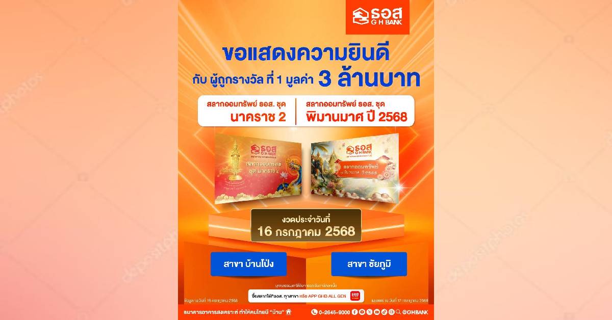 โดยการออกรางวัลสลากออมทรัพย์ ธอส. งวดวันที่ 16 กรกฎาคม 2568 มีจำนวนรวม 10 ชุด ประกอบด้วย ชุดวิมานเมฆ Plus ปี 2567, ชุดพราวพิมาน Plus ปี 2566 ชุดพิมานมาศ Plus Phase 2, ชุดพิมานมาศ ปี 2568, ชุดเกล็ดดาว Plus ชุดต่อเงินต่อทอง, ชุดขาลเพิ่มพูน, ชุดขาลเพิ่มพูน ปี 2566, ชุดนาคราช และชุดนาคราช 2 ทั้งนี้ ธนาคารได้ถ่ายทอดสดการออกรางวัลให้ลูกค้าประชาชนได้ติดตามรับชมผ่านทาง Facebook Fanpage ธนาคารอาคารสงเคราะห์ และประกาศผลการออกรางวัลทางเว็บไซต์ธนาคารอาคารสงเคราะห์ www.ghbank.co.th เว็บไซต์สำนักงานสลากกินแบ่งรัฐบาล www.glo.or.th และสามารถตรวจผลรางวัล ผ่าน Application : GHB ALL GEN ได้ตั้งแต่เวลา 21.00 น. ของวันที่ 16 กรกฎาคม 2568 เป็นต้นไป
