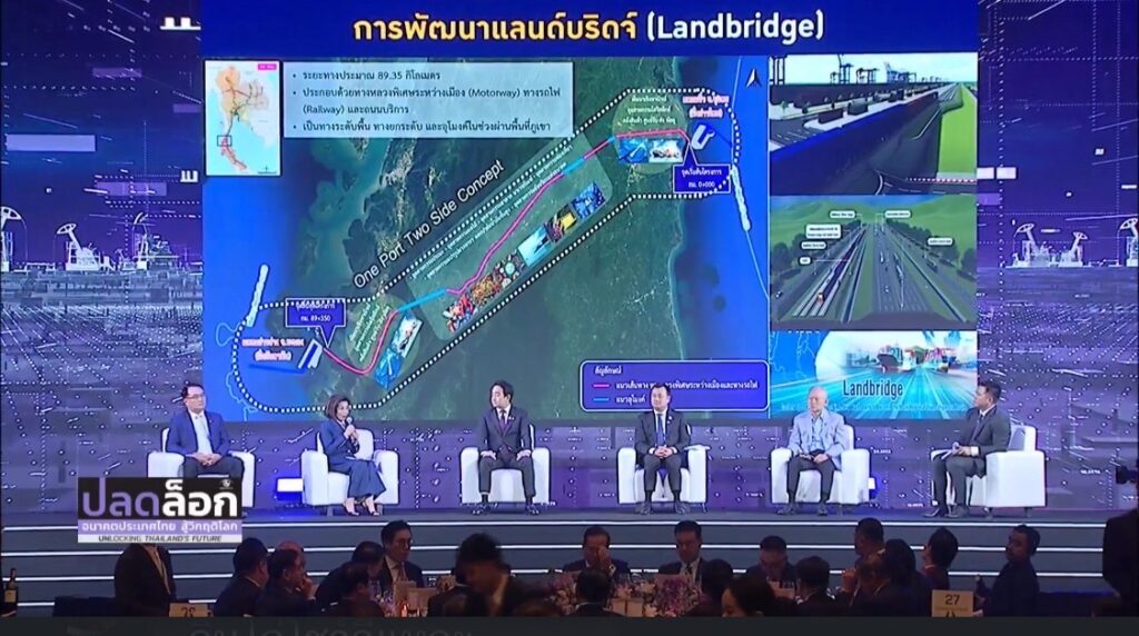 นางมนพร กล่าวว่า หากจะปลดล็อกประเทศให้เติบโตอย่างยั่งยืนจะต้องเร่งพัฒนาโครงสร้างพื้นฐานในประเทศ ซึ่งโครงการที่จะเปลี่ยนเศรษฐกิจไทยให้เติบโตอย่างยั่งยืนคือ โครงการแลนด์บริดจ์ ที่เชื่อมโยงการขนส่งระหว่างอ่าวไทยและอันดามัน ซึ่งจะครอบคลุมการพัฒนาใน 4 จังหวัดคือ ชุมพร ระนอง สุราษฎร์ธานี และนครศรีธรรมราช เพราะการขนส่งทางทะเลมีต้นทุนที่ต่ำจะช่วยเพิ่มความสามารถในการแข่งขันให้กับประเทศไทย ซึ่งจะมีการสร้างท่าเรือน้ำลึก สร้างรถไฟทางคู่เชื่อม มูลค่าลงทุนรวม 1 ล้านล้านบาท โดยจะลงทุนในเฟสแรก มูลค่า 5แสนล้านบาท