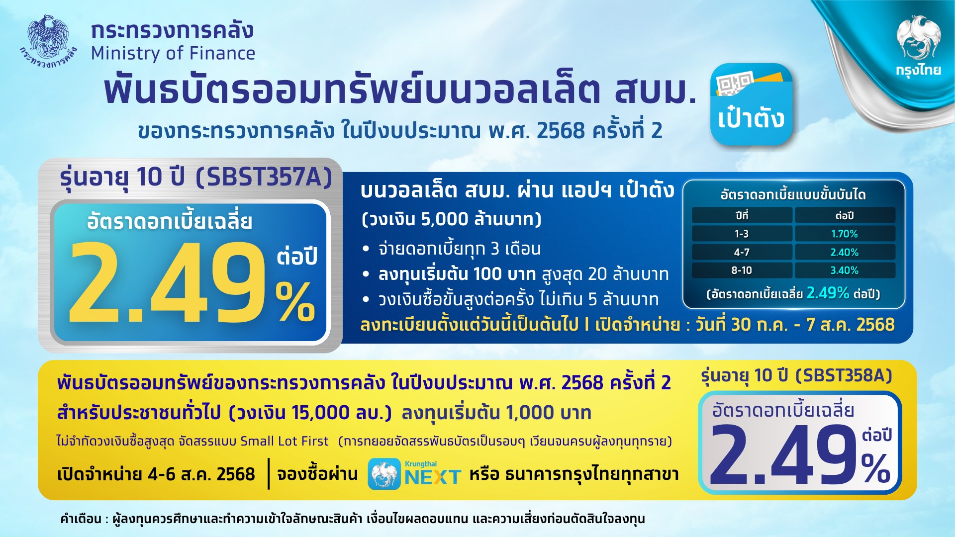 22 ก.ค. – ธนาคารกรุงไทย เดินหน้าตอบโจทย์ผู้ลงทุนอย่างต่อเนื่อง เพื่อสร้างความมั่นคงทางการเงิน เตรียมเสนอขายพันธบัตรออมทรัพย์วอลเล็ต สบม. ของกระทรวงการคลัง ปีงบประมาณ 2568 ครั้งที่ 2 ผ่านแอปฯ เป๋าตัง วงเงิน 5,000 ล้านบาท รุ่นอายุ 10 ปี อัตราดอกเบี้ยแบบขั้นบันไดเฉลี่ย 2.49% ต่อปี ลงทุนง่าย เริ่มต้นเพียง 100 บาท เสนอขาย 30 ก.ค.-7 ส.ค.นี้