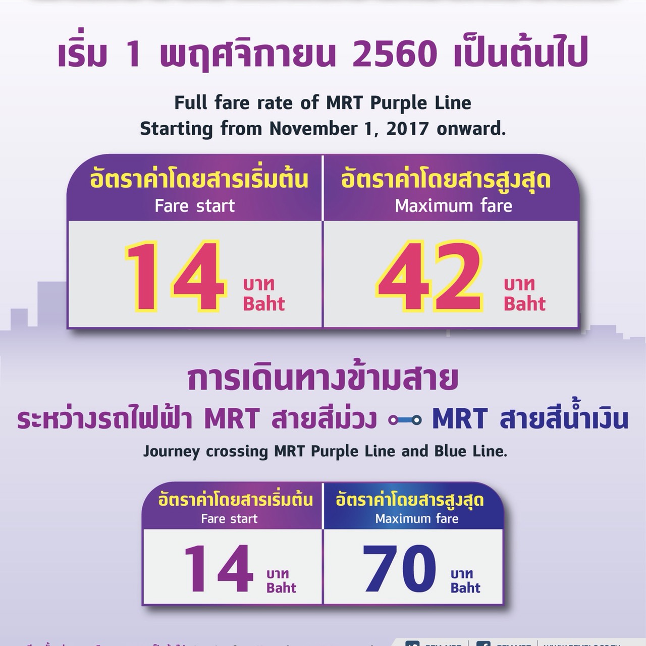 บริษัท ทางด่วนและรถไฟฟ้ากรุงเทพ จำกัด (มหาชน) (BEM) แจ้งใช้อัตราค่าโดยสารตามปกติของระบบรถไฟฟ้ามหานคร สายฉลองรัชธรรม (MRT สายสีม่วง) ราคาเริ่มต้น 14 บาทและสูงสุดไม่เกิน 42 บาท พร้อมทั้งแจ้งใช้อัตราค่าโดยสารกรณีเดินทางข้ามสายระหว่างรถไฟฟ้ามหานคร สายฉลองรัชธรรม (MRT สายสีม่วง) กับ รถไฟฟ้ามหานคร สายเฉลิมรัชมงคล (MRT สายสีน้ำเงิน) ราคาเริ่มต้น 14 บาทและสูงสุดไม่เกิน 70 บาท มีผลตั้งแต่ 1 พฤศจิกายน 2560 เป็นต้นไป.-สำนักข่าวไทย