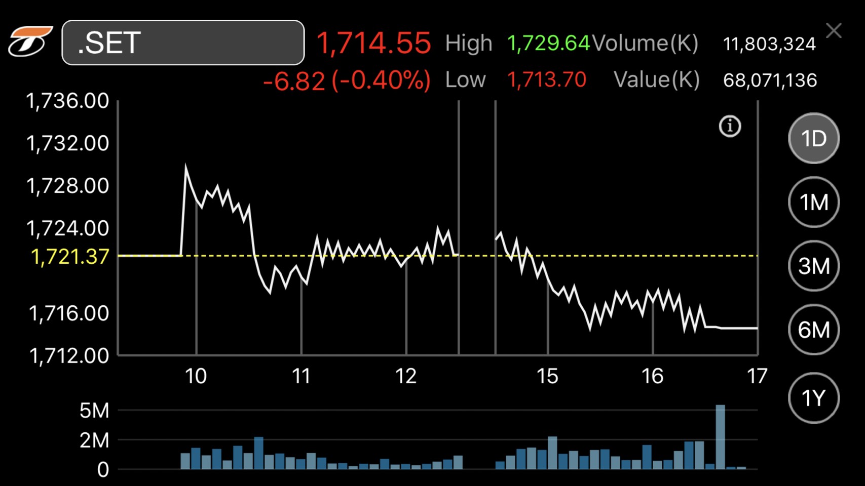 การซื้อขายหุ้นวันนี้ ดัชนีหุ้นไทยเคลื่อนไหวทั้งในแดนบวก-ลบ โดยดัชนีฯแตะจุดสูงสุดที่ 1,729.64 จุด และแตะจุดต่ำสุดที่ระดับ 1,713.70 จุด ตลาดหุ้นไทยวันนี้ค่อนข้างผันผวน จากแรงขายทำกำไร เนื่องจากยังไม่มีปัจจัยใหม่ ๆ เข้ามา