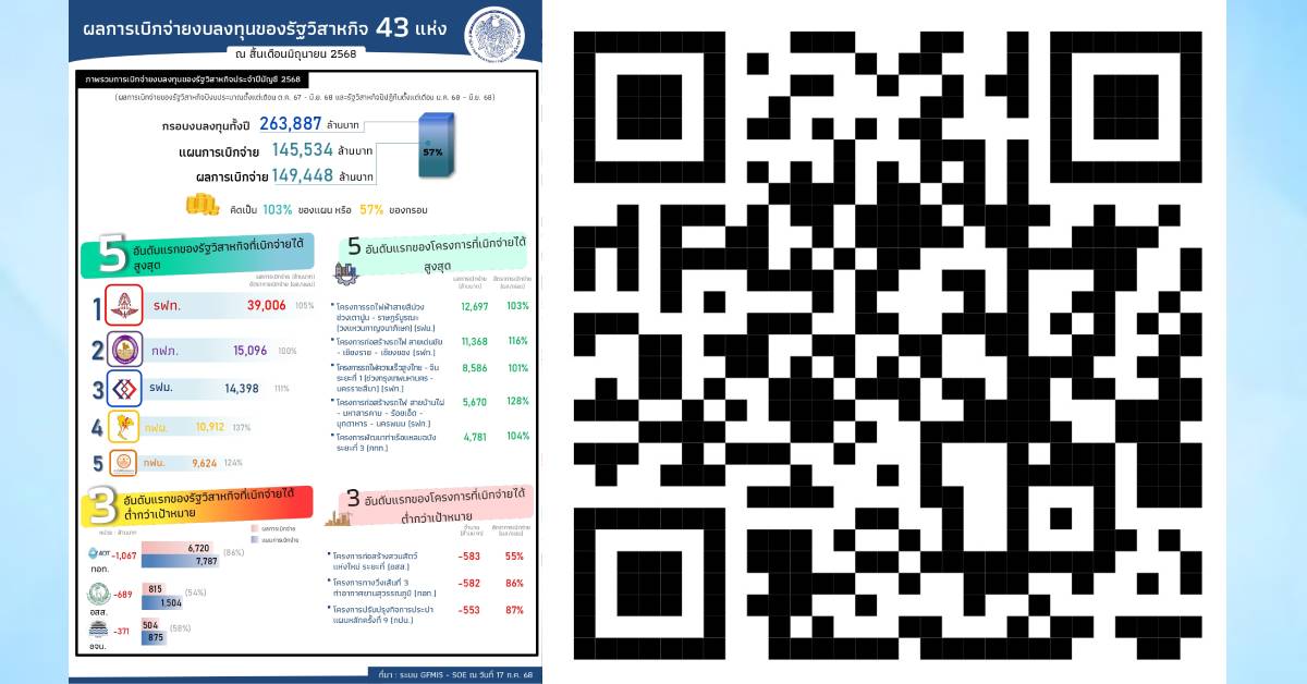 นายธิบดี วัฒนกุล ผู้อำนวยการสำนักงานคณะกรรมการนโยบายรัฐวิสาหกิจ (สคร.) เปิดเผยว่า การเบิกจ่ายงบลงทุนของรัฐวิสาหกิจที่อยู่ในการติดตามของ สคร. อย่างใกล้ชิด จำนวน 43 แห่ง แบ่งออกเป็น 2 กลุ่ม ได้แก่ กลุ่มรัฐวิสาหกิจที่ใช้ปีบัญชีตามปีงบประมาณ (รัฐวิสาหกิจปีงบประมาณ) และกลุ่มรัฐวิสาหกิจที่ใช้ปีบัญชีตามปีปฏิทิน (รัฐวิสาหกิจปีปฏิทิน) โดยในปี 2568 มีกรอบงบลงทุน จำนวน 263,887 ล้านบาท และมีผลการเบิกจ่ายสะสมจนถึงสิ้นเดือนมิถุนายน 2568 จำนวน 149,448 ล้านบาท หรือคิดเป็นร้อยละ 103 ของแผนการเบิกจ่าย ประกอบด้วยผลการเบิกจ่ายงบลงทุนของรัฐวิสาหกิจปีงบประมาณ (ตั้งแต่เดือนตุลาคม 2567 – เดือนมิถุนายน 2568) 34 แห่ง จำนวน 95,162 ล้านบาท หรือคิดเป็นร้อยละ 100 ของแผนการเบิกจ่าย และรัฐวิสาหกิจปีปฏิทิน (ตั้งแต่เดือนมกราคม 2568 – เดือนมิถุนายน 2568) 9 แห่ง จำนวน 54,286 ล้านบาท หรือคิดเป็นร้อยละ 109 ของแผนการเบิกจ่าย ทั้งนี้ รัฐวิสาหกิจปีงบประมาณที่เบิกจ่ายได้ไม่ต่ำกว่าร้อยละ 95 ของแผนการเบิกจ่ายและมีมูลค่าสูงสุด 3 อันดับแรก ได้แก่ การรถไฟแห่งประเทศไทย (รฟท.) การรถไฟฟ้าขนส่งมวลชนแห่งประเทศไทย (รฟม.) และการประปานครหลวง สำหรับรัฐวิสาหกิจปีปฏิทินที่เบิกจ่ายได้ไม่ต่ำกว่าร้อยละ 95 ของแผนการเบิกจ่ายและมีมูลค่าสูงสุด 3 อันดับแรก ได้แก่ การไฟฟ้าส่วนภูมิภาค การไฟฟ้าฝ่ายผลิตแห่งประเทศไทย และการไฟฟ้านครหลวง.-515- สำนักข่าวไทย