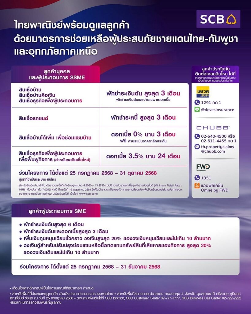 กรุงเทพฯ 26 ก.ค.- ธนาคารไทยพาณิชย์ ออกมาตรการเร่งด่วนเพื่อช่วยเหลือลูกค้าที่ได้รับผลกระทบจากสถานการณ์ความขัดแย้งระหว่างไทย-กัมพูชา และอุทกภัยในพื้นที่ภาคเหนือ
