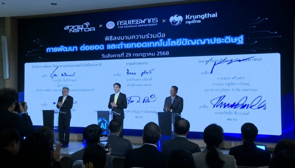 กรมสรรพากรร่วมกับ สำนักงานพัฒนาวิทยาศาสตร์และเทคโนโลยีแห่งชาติ (สวทช.) ภายใต้สังกัดกระทรวงการอุกมศึกษาวิทยาศาสตร์ วิจัยและนวัตกรรม และธนาคารกรุงไทย จํากัด (มหาชน)เข้าร่วมพิธีลงนามบันทึกข้อตกลงความร่วมมือด้านการพัฒนา ต่อยอด และถ่ายทอดเทคโนโลยีปัญญาประดิษฐ์ เพื่อพัฒนาเทคโนโลยี AI ให้สอดคล้องกับยุทธศาสตร์ชาติ สนับสนุนการให้บริการประชาชนและเพิ่มประสิทธิภาพภาครัฐ