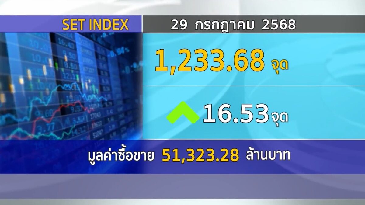 กทม. 29 ก.ค.-ตลาดหลักทรัพย์ฯ ปิดวันนี้ 1,233.68 จุด เพิ่มขึ้น 16.53 จุด (+1.36%) มูลค่าซื้อขาย 51,323.28 ล้านบาท