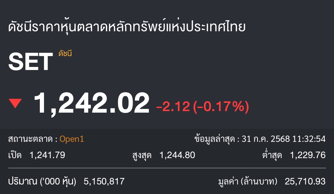 ผู้สื่อข่าวรายงานภาวะดัชนีหุ้นไทยเปิดตลาดภาคเช้าวันนี้ (31 ก.ค.) ดัชนีเปิดที่ 1,243.27 จุด ลดลง 0.87 จุด โดยเมื่อเวลา 11.32 น. ดัชนีอยู่ที่ 1,242.02 จุด ลดลง 2.12 จุด หรือลดลง 0.17% มูลค่าการซื้อขาย 25,710.93 ล้านบาท
