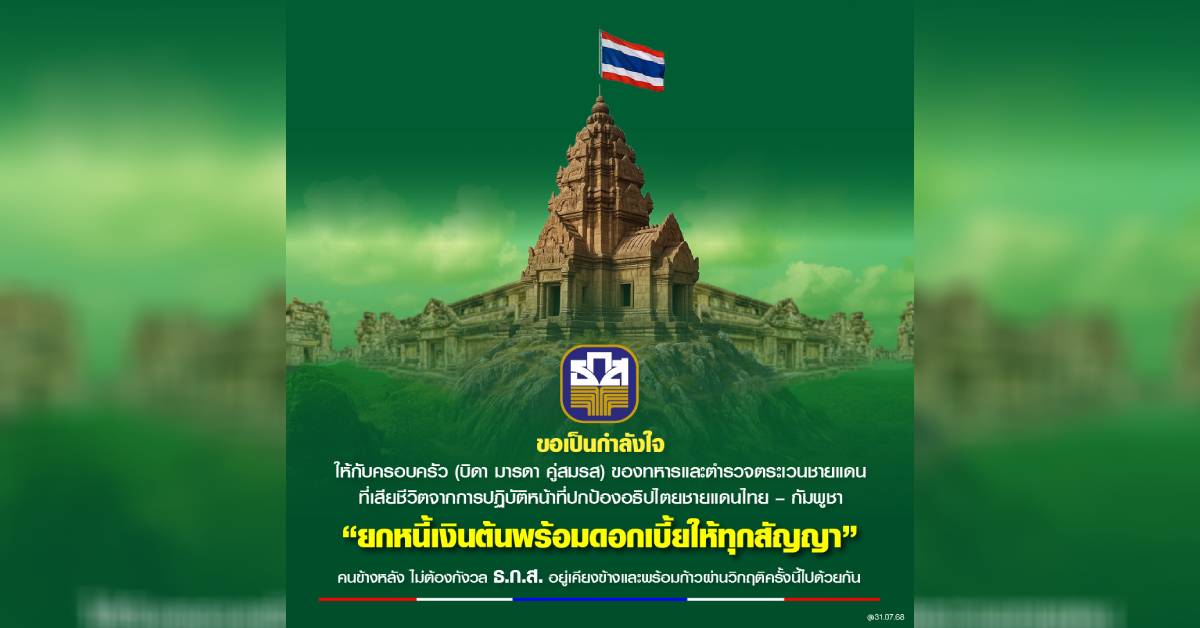 กรุงเทพฯ 31 ก.ค.-บอร์ด ธ.ก.ส. เห็นชอบช่วยเหลือครอบครัวทหาร และ ตชด. วีรบุรุษผู้เสียสละชีวิต เหตุปะทะชายแดนไทย-กัมพูชา กรณีญาติเป็นลูกค้า ธ.ก.ส. ยกหนี้เงินต้น ดอกเบี้ย-ทุกสัญญา ใช้แหล่งเงินทุน ธ.ก.ส. ให้ความช่วยเหลือและสงเคราะห์ลูกหนี้