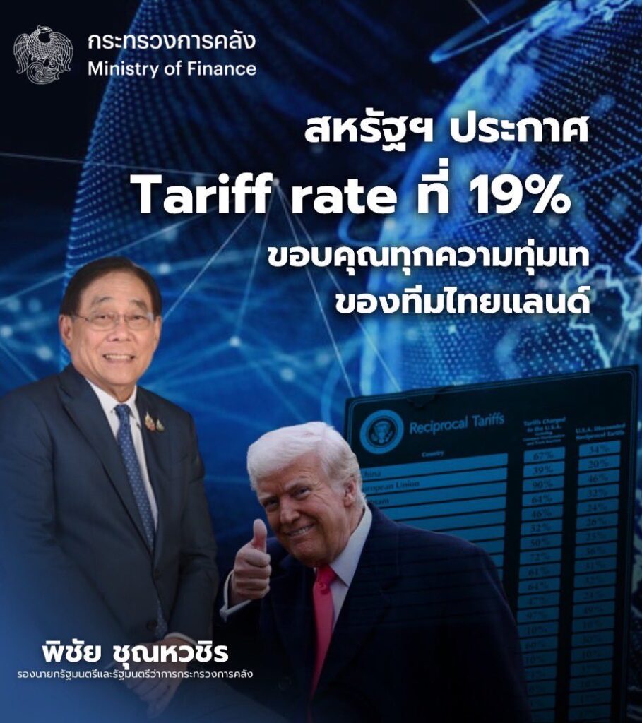 นายพิชัย ชุณหวชิร รองนายกรัฐมนตรีและรัฐมนตรีว่าการกระทรวงการคลัง กล่าวว่า การประกาศ Tariff rate ที่ ช่วยให้ไทยยังคงแข่งขันได้ในเวทีโลก สร้างความเชื่อมั่นต่อนักลงทุน และเปิดประตูสู่การขยายตัวทางเศรษฐกิจ รายได้ และโอกาสใหม่ ๆ ให้กับประเทศไทย การทำงานยังไม่สิ้นสุด รัฐบาลตระหนักถึงผลกระทบต่อผู้ประกอบการและพี่น้องเกษตรกร จึงได้จัดเตรียมมาตรการรองรับอย่างรอบด้าน
