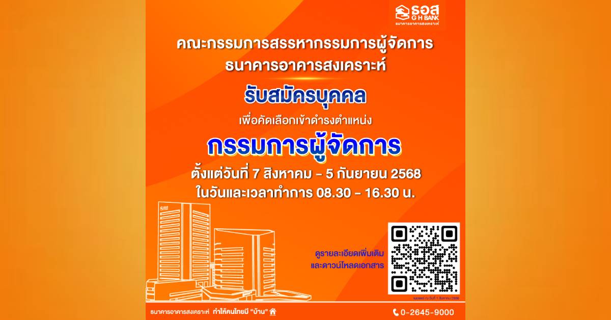 กรุงเทพฯ 1 ส.ค. – ธอส. เปิดรับสมัคร กรรมการผู้จัดการธนาคารฯ คนใหม่ ตั้งแต่วันที่ 7 สิงหาคม – 5 กันยายน 2568