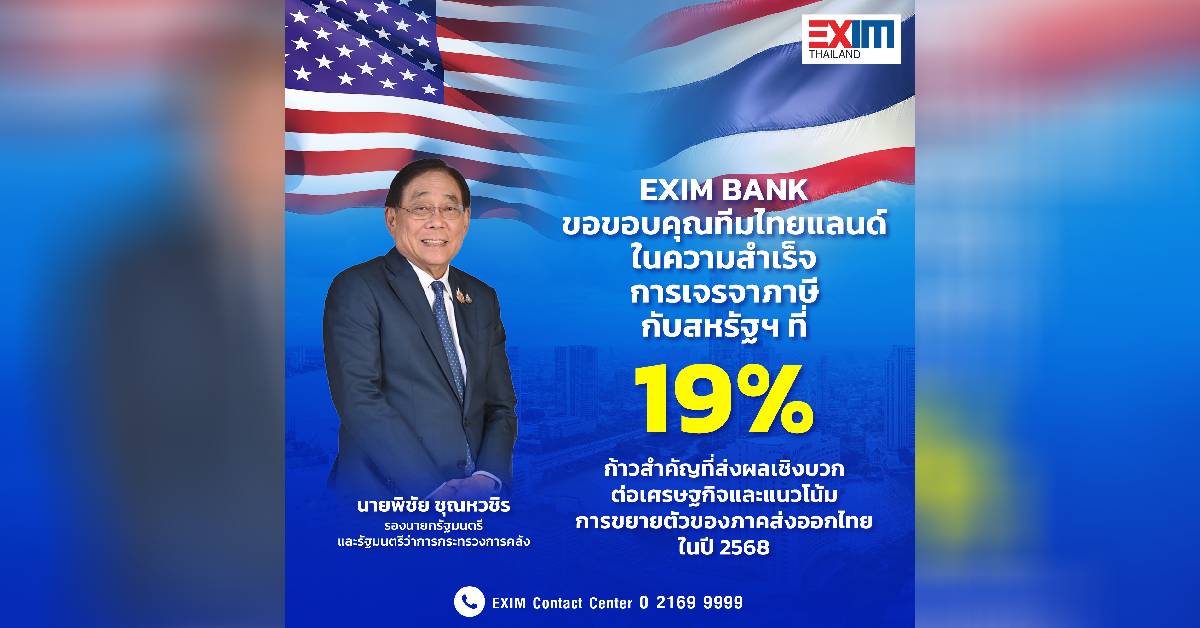 กรุงเทพฯ 2 ส.ค.-EXIM BANK ชี้อัตราภาษีนำเข้าสหรัฐฯ 19% ผลสำเร็จการเจรจาของทีมไทยแลนด์ หนุนภาคส่งออกไทยปี 68 ขยายตัวดีขึ้น