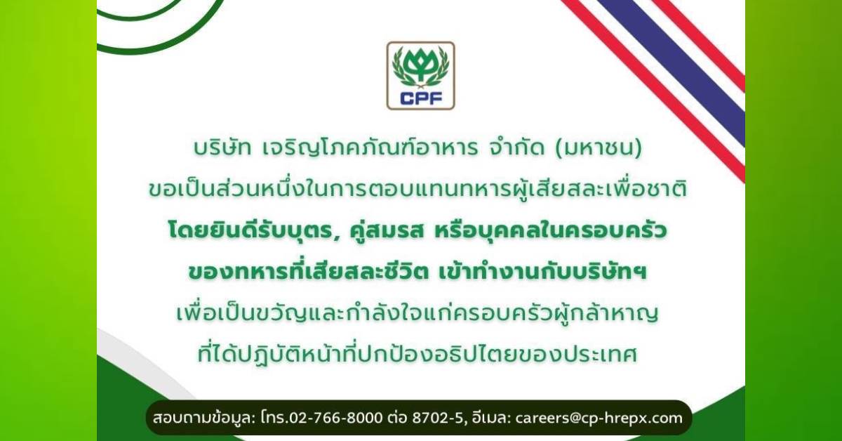 CPF แจ้งว่า ขอร่วมเชิดชูทหารกล้า ผู้เสียสละชีวิตเพื่อปกป้องประเทศไทย เปิดรับ บุตร คู่สมรส หรือบุคคลในครอบครัว ของทหารที่เสียชีวิตจากการปฏิบัติหน้าที่จากเหตุการณ์ปะทะระหว่างไทย-กัมพูชา เข้าทำงานกับบริษัทฯ เพื่อสานต่อคุณค่าของความกล้าหาญ