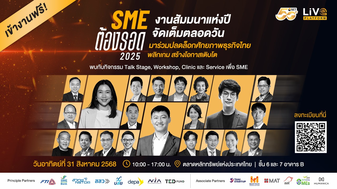 LiVE Platform โดยบริษัท ไลฟ์ฟินคอร์ป จำกัด ภายใต้กลุ่มตลาดหลักทรัพย์แห่งประเทศไทย ชวนผู้ประกอบการ SMEs และ Startups รวมถึงผู้บริหารองค์กร และทีมงานสายพัฒนาองค์กร ร่วมงานสัมมนา SME แห่งปี “SME ต้องรอด 2025” มาปลดล็อคศักยภาพธุรกิจไทย พลิกเกม ฝ่าวิกฤตเศรษฐกิจไปด้วยกัน พบกับการรวมตัวของผู้เชี่ยวชาญแถวหน้าของประเทศที่จะมาเปิดทุกมุมมอง พร้อมเสิร์ฟกลยุทธ์ที่ “ใช้ได้จริง” ให้คุณเข้าใจทุกเทรนด์ ทั้งเศรษฐกิจ เทคโนโลยี การเงิน การเข้าถึงแหล่งทุน และการบริหารคน ใน 4 Stages