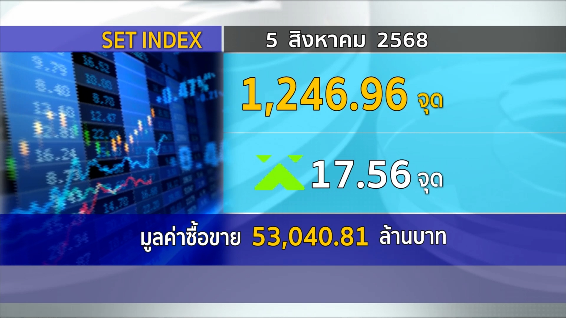กทม. 5 ส.ค.- ตลาดหลักทรัพย์ฯ ปิดวันนี้ 1,246.96 จุด เพิ่มขึ้น 17.56 จุด (+1.43%) มูลค่าซื้อขาย 53,040.81 ล้านบาท