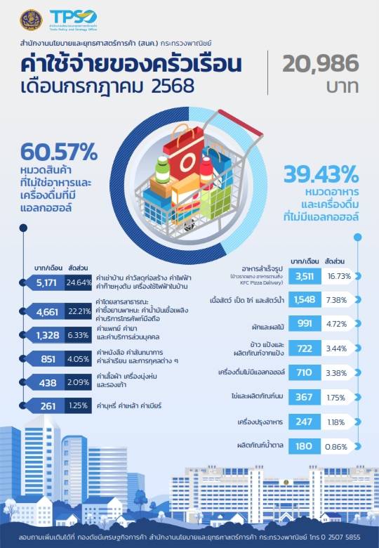 นายพูนพงษ์ นัยนาภากรณ์ ผู้อำนวยการสำนักงานนโยบายและยุทธศาสตร์การค้า (สนค.) และโฆษกกระทรวงพาณิชย์ เปิดเผยว่า ดัชนีราคาผู้บริโภคทั่วไป (CPI) เดือนกรกฎาคม 2568 อยู่ที่ 100.15 ลดลงจาก 100.86 ในเดือนเดียวกันของปีก่อน ส่งผลให้อัตราเงินเฟ้อทั่วไปลดลงร้อยละ 0.70 เมื่อเทียบกับปีก่อน (YoY) โดยมีปัจจัยหลักมาจากราคาสินค้ากลุ่มผักสด ผลไม้สด และของใช้ส่วนบุคคลที่ปรับตัวลดลง ประกอบกับราคาพลังงาน อาทิ น้ำมันเชื้อเพลิงและค่าไฟฟ้า ที่ได้รับอานิสงส์จากมาตรการช่วยเหลือของภาครัฐ ขณะที่สินค้าบางรายการ เช่น ค่าเช่าบ้านและค่าอาหารสัตว์เลี้ยง ปรับตัวเพิ่มขึ้น แต่ไม่มีนัยสำคัญต่อภาพรวม