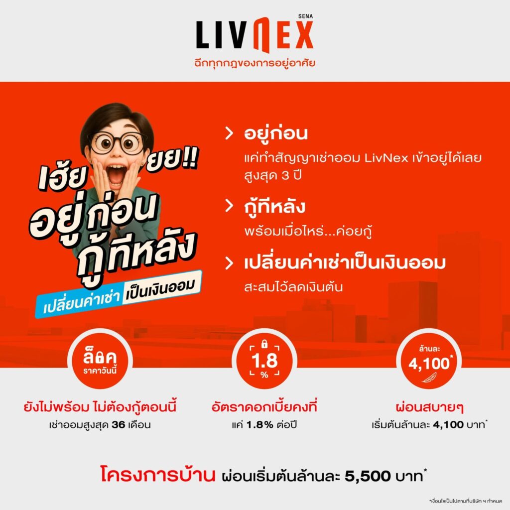 กรุงเทพฯ 6 ส.ค. – บมจ. เสนาดีเวลลอปเม้นท์ ออกแคมเปญ “เฮ้ย อยู่ก่อน กู้ทีหลัง” เปลี่ยนค่าเช่าเป็นเงินออม ภายใต้ solution LivNex – เช่าออมบ้าน เพื่อตอบโจทย์คนที่อยากมีบ้าน แก้ปัญหา “กู้ไม่ผ่าน”