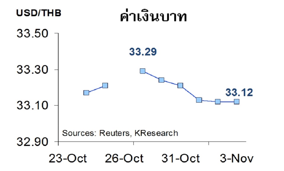 สำหรับสัปดาห์ถัดไป (6-10 พ.ย.) ธนาคารกสิกรไทยประเมินกรอบการเคลื่อนไหวของเงินบาทที่ 33.00-33.30 บาทต่อดอลลาร์ฯ โดยคงต้องติดตามการตอบรับของนักลงทุนหลังการรายงานตัวเลขตลาดแรงงานของสหรัฐฯ ขณะที่ ตัวเลขเศรษฐกิจต่างประเทศที่สำคัญระหว่างสัปดาห์ ได้แก่ ตัวเลขสต็อกสินค้าภาคค้าส่งเดือนก.ย. และดัชนีความเชื่อมั่นผู้บริโภค (เบื้องต้น) เดือนพ.ย.ของสหรัฐฯ ตัวเลขการค้าระหว่างประเทศและเงินเฟ้อเดือนต.ค. ของจีน รวมถึงรายงานดัชนี PMI ภาคบริการเดือนต.ค. ของหลายๆ ประเทศทั่วโลก ส่วนจุดสนใจเพิ่มเติมของตลาดในประเทศน่าจะอยู่ที่การประชุมกนง. ในวันที่ 8 พ.ย. นี้