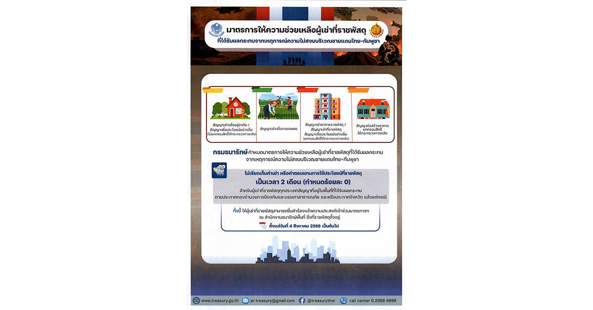 กรุงเทพฯ 6 ส.ค.- “ธนารักษ์” ออกมาตรการช่วยเหลือผู้เช่าที่ราชพัสดุที่ได้รับผลกระทบบริเวณชายแดนไทย-กัมพูชา ยกเว้นค่าเช่าที่ราชพัสดุ 2 เดือน