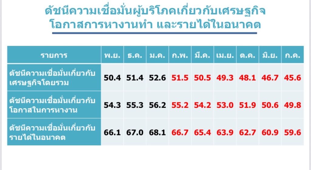 ดัชนีความเชื่อมั่นเกี่ยวกับเศรษฐกิจโดยรวม ดัชนีความเชื่อมั่นเกี่ยวกับโอกาสหางานทำโดยรวม และดัชนีความเชื่อมั่นเกี่ยวกับรายได้ในอนาคตอยู่ที่ระดับ 45.6, 49.8 และ 59.6 ตามลำดับ ปรับตัวลดลงทุกรายการต่อเนื่องเป็นเดือนที่ 6 โดยปรับตัวลดลงเมื่อเทียบกับดัชนีในเดือนมิถุนายน ที่อยู่ในระดับ 46.7 50.6 และ 60.9 ตามลำดับ การที่ดัชนียังอยู่ในระดับต่ำกว่าปกติ (ที่ระดับ 100) แสดงว่า ผู้บริโภคยังไม่มีความมั่นใจเกี่ยวกับสถานการณ์ทางเศรษฐกิจ โอกาสในการหางานทำ และรายได้ในอนาคต เพราะมีความกังวลเกี่ยวกับสถานการณ์การเมืองในประเทศ และค่าครองชีพที่ยังทรงตัวอยู่ในระดับสูง ตลอดจนปัญหาเศรษฐกิจโลกที่มีความเสี่ยงเข้าสู่ภาวะชะลอตัวลงจากสงครามการค้าที่กำลังเกิดขึ้น ซึ่งจะส่งผลกระทบให้เศรษฐกิจไทยและการจ้างงานมีโอกาสฟื้นตัวได้ช้าในอนาคต ซึ่งจะทำให้รายได้ในอนาคตของผู้บริโภคมีความไม่แน่นอนสูง