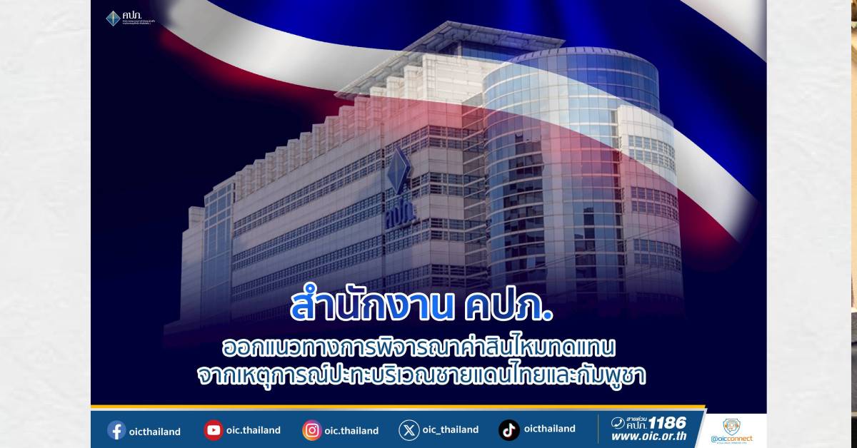 จากเหตุการณ์ปะทะบริเวณชายแดนไทยและกัมพูชาเกี่ยวกับความตึงเครียดในพื้นที่ สำนักงาน คปภ. ขอให้บริษัทประกันภัยที่รับประกันภัยเร่งสำรวจความเสียหาย และหารือกับบริษัทประกันภัยต่อเกี่ยวกับแนวทางการตีความเงื่อนไขกรมธรรม์ประกันภัยให้ชัดเจน เพื่อพิจารณาการชดใช้ค่าสินไหมทดแทนโดยเร็ว เบื้องต้น สำนักงาน คปภ. เห็นว่าเหตุการณ์ดังกล่าวยังไม่เข้าข่ายคำว่า “สงคราม (war)” ในข้อยกเว้นตามกรมธรรม์ประกันภัย อย่างไรก็ตาม หากบริษัทเห็นว่าเข้าข้อยกเว้นอื่นใดเพิ่มเติม ที่จะไม่คุ้มครองตามเงื่อนไขกรมธรรม์ประกันภัย ขอให้พิจารณาถ้อยคำตามกรมธรรม์ประกันภัยและข้อเท็จจริงเป็นรายกรณีไป ซึ่งหากกรณีปรากฎว่า เข้าข้อยกเว้นอื่นใด
