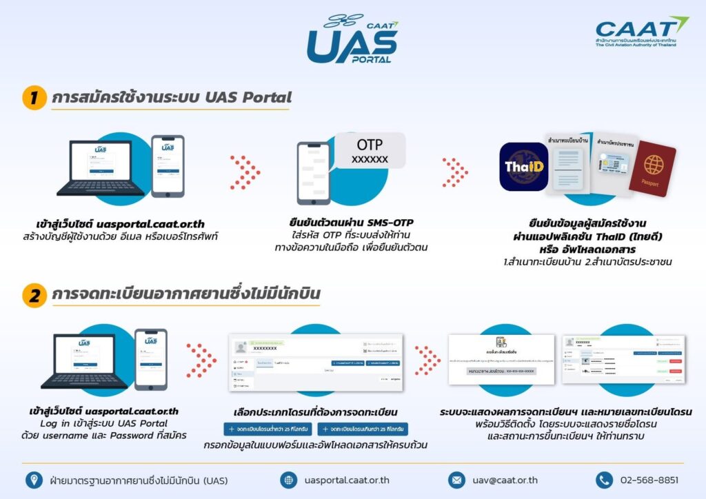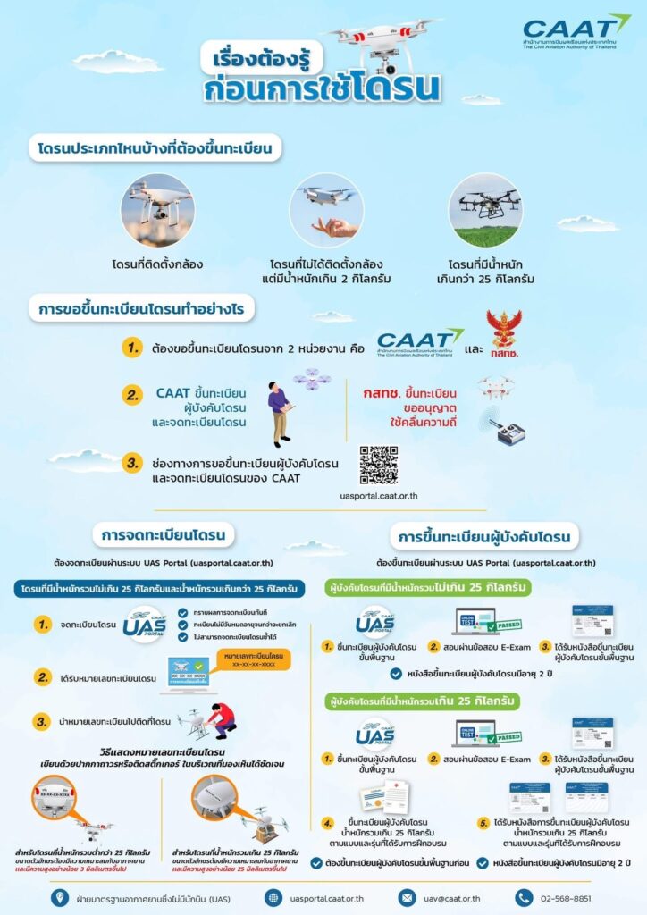 โดยการหารือมีประเด็นว่าโดรนเกษตรที่จะใช้ต้องผ่านการขึ้นทะเบียนผู้บังคับหรือผู้ควบคุมอากาศยาน และมีการลงทะเบียนอย่างถูกต้องตามกฎหมาย ผ่านระบบ UAS Portal ของสำนักงานการบินพลเรือนแห่งประเทศไทย การบินสามารถบินได้เฉพาะเวลากลางวัน ตั้งแต่เวลา 06.00 น. ถึง 18.00 น. การลงทะเบียนไม่มีค่าใช้จ่ายใดๆ ซึ่งจะมีประกาศการผ่อนปรนการบินโดรนให้ประชาชนทราบต่อไป พร้อมเน้นย้ำปัจจุบันผู้ซื้อโดรนที่มีจำหน่ายตามท้องตลาดทั่วไป มีหน้าที่จะต้องลงทะเบียนที่จุดขายคล้ายกับการซื้อซิมโทรศัพท์มือถือด้วย.-513-สำนักข่าวไทย