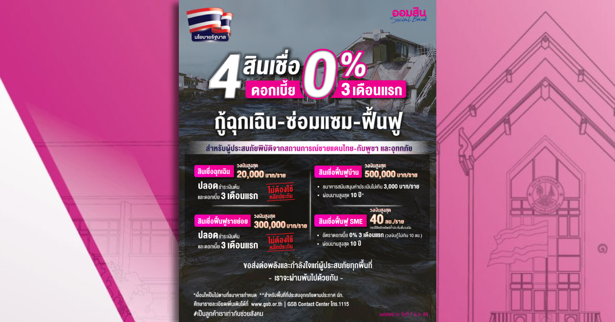 ธนาคารออมสินยังคงยึดมั่นบทบาท “ธนาคารเพื่อสังคม” ที่อยู่เคียงข้างคนไทยในทุกสถานการณ์ และพร้อมเป็นพลังทางการเงินในการฟื้นฟูชีวิตความเป็นอยู่และขับเคลื่อนเศรษฐกิจของประเทศ ที่ผ่านมาธนาคารได้ส่งความช่วยเหลืออย่างเต็มกำลัง ทั้งการจัดส่งถุงยังชีพ “ออมสินห่วงใย” ไปยังพื้นที่ประสบภัยพิบัติทั้ง 2 เหตุการณ์แล้วกว่า 2,500 ชุด เพื่อบรรเทาความเดือดร้อนเฉพาะหน้า สนับสนุนงบประมาณจัดซื้อสิ่งของจำเป็น รวมกว่า 2.5 ล้านบาท พร้อมออกมาตรการเร่งด่วน “พักชำระหนี้อัตโนมัติ 3 เดือน โดยไม่คิดดอกเบี้ย และธนาคารเป็นผู้รับภาระดอกเบี้ยแทนลูกหนี้ทั้งหมดในช่วงเวลาดังกล่าว” เพื่อลดภาระทางการเงินให้ลูกหนี้ได้ฟื้นตัว ศึกษารายละเอียดเพิ่มเติมเกี่ยวกับสินเชื่อได้ที่เว็บไซต์ www.gsb.or.th . -สำนักข่าวไทย