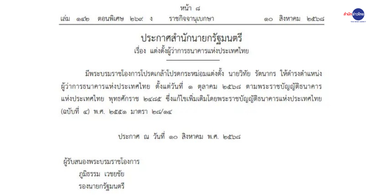 มีพระบรมราชโองการโปรดเกล้าโปรดกระหม่อมแต่งตั้ง นายวิทัย รัตนากร ให้ดำรงตำแหน่ง ผู้ว่าการธนาคารแห่งประเทศไทย ตั้งแต่วันที่ 1 ตุลาคม 2568 ตามพระราชบัญญัติธนาคารแห่งประเทศไทย พุทธศักราช 2485 ซึ่งแก้ไขเพิ่มเติมโดยพระราชบัญญัติธนาคารแห่งประเทศไทย (ฉบับที่ 4) พ.ศ. 2551 มาตรา 28/14 โดยมีนายภูมิธรรม เวชยชัย รองนายกรัฐมนตรี เป็นผู้รับสนองพระบรมราชโองการ. -516-สำนักข่าวไทย