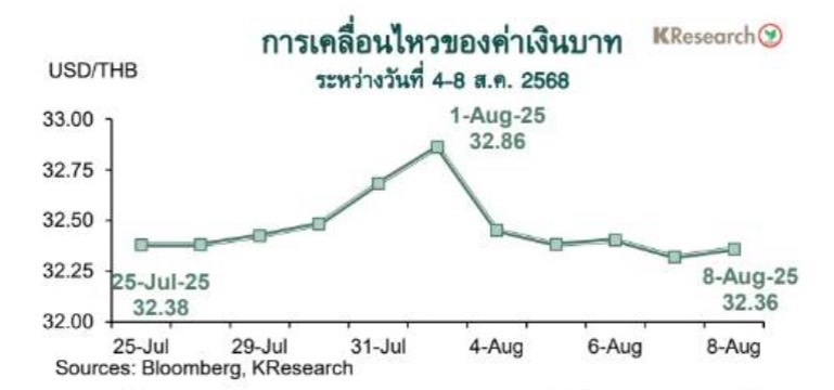 ส่วนสัปดาห์นี้ (11-15 ส.ค.) ธนาคารกสิกรไทยมองกรอบการเคลื่อนไหวของค่าเงินบาทที่ระดับ 32.10-32.80 บาทต่อดอลลาร์ ขณะที่ศูนย์วิจัยกสิกรไทยประเมินปัจจัยสำคัญที่ต้องติดตาม ได้แก่ ผลการประชุม กนง. (13 ส.ค.) ทิศทางฟันด์โฟลว์ของต่างชาติและราคาทองคำในตลาดโลก ส่วนตัวเลขเศรษฐกิจสหรัฐที่สำคัญ ได้แก่ ดัชนีราคาผู้บริโภค ดัชนีราคาผู้ผลิต ดัชนีราคาสินค้าส่งออกและนำเข้า ตัวเลขยอดค้าปลีก การผลิตภาคอุตสาหกรรมเดือน ก.ค. ผลสำรวจภาคการผลิตของเฟดสาขานิวยอร์กและดัชนีความเชื่อมั่นผู้บริโภค (เบื้องต้น) เดือน ส.ค. และตัวเลขจำนวนผู้ขอรับสวัสดิการว่างงานรายสัปดาห์ นอกจากนี้ตลาดยังรอติดตามข้อมูลเศรษฐกิจและเงินเฟ้อเดือน ก.ค. ของจีน ตัวเลขจีดีพีไตรมาส 2/2568 ของอังกฤษยูโรโซนและญี่ปุ่นด้วยเช่นกัน