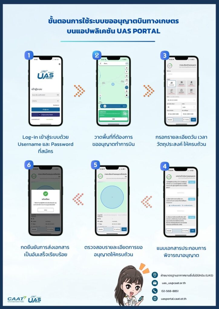 “สถานการณ์ด้านความมั่นคงในปัจจุบันมีความอ่อนไหวและส่งผลกระทบต่อเนื่องอย่างหลีกเลี่ยงไม่ได้มายังเกษตรกรชาวไทย CAAT จึงขอเชิญชวนนักบินโดรนเกษตรและเกษตรกรที่ครอบครองโดรนทุกรายโปรดขึ้นทะเบียนตัวโดรนและขอให้ผู้ที่มีคุณสมบัติครบถ้วนทำการขึ้นทะเบียนผู้บังคับโดรน ผ่านระบบ UAS Portal ผ่านทางเว็บไซต์ uasportal.caat.or.th และ Mobile Application “UAS Portal” รองรับทั้งระบบ iOS และ Android โดยไม่มีค่าใช้จ่ายใด ๆ ทั้งสิ้น และแนะนำให้ผู้ใช้งานตรวจสอบพื้นที่อนุญาตบิน ผ่านแอปฯ UAS Portal” ผู้อำนวยการสำนักงานการบินพลเรือนแห่งประเทศไทย กล่าว