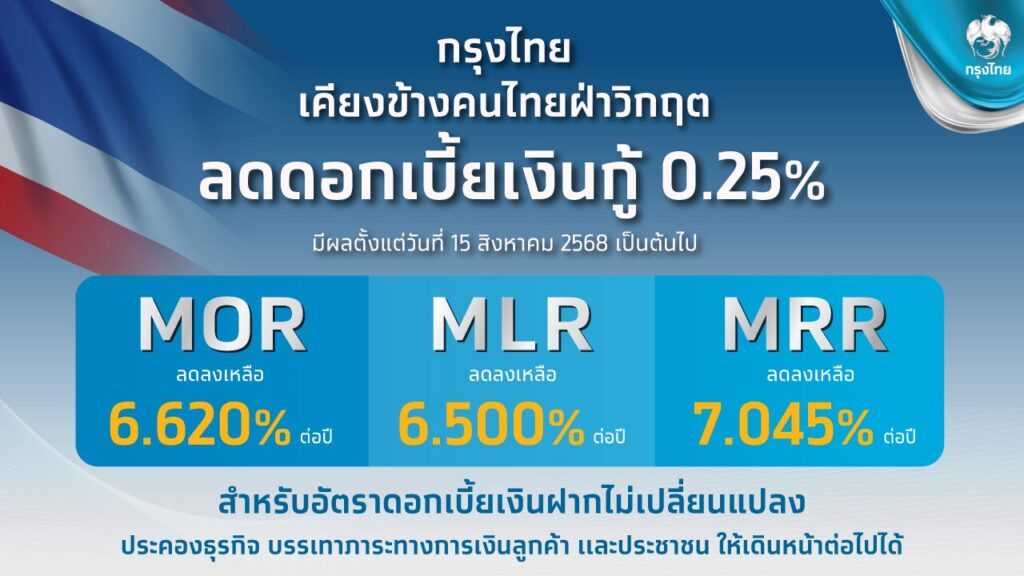 ธนาคารกรุงไทย เร่งสนับสนุนคนไทยและธุรกิจไทยให้สามารถก้าวผ่านความท้าทายครั้งสำคัญ จึงประกาศปรับลดอัตราดอกเบี้ยเงินกู้ 0.25% เพื่อช่วยลูกค้าทุกกลุ่มเร่งปรับตัว ภายใต้ข้อจำกัดจากปัญหาเชิงโครงสร้างที่ยังต้องใช้เวลาในการแก้ไข ลดภาระทางการเงินของประชาชน โดยเฉพาะครัวเรือนกลุ่มเปราะบาง ผู้ประกอบอาชีพอิสระ และ SME ประคองธุรกิจ และลูกค้า ประชาชนให้เดินหน้าต่อไปได้ โดยการลดอัตราดอกเบี้ยในครั้งนี้ สอดคล้องกับการปรับลดดอกเบี้ยของคณะกรรมการนโยบายการเงิน(กนง.)