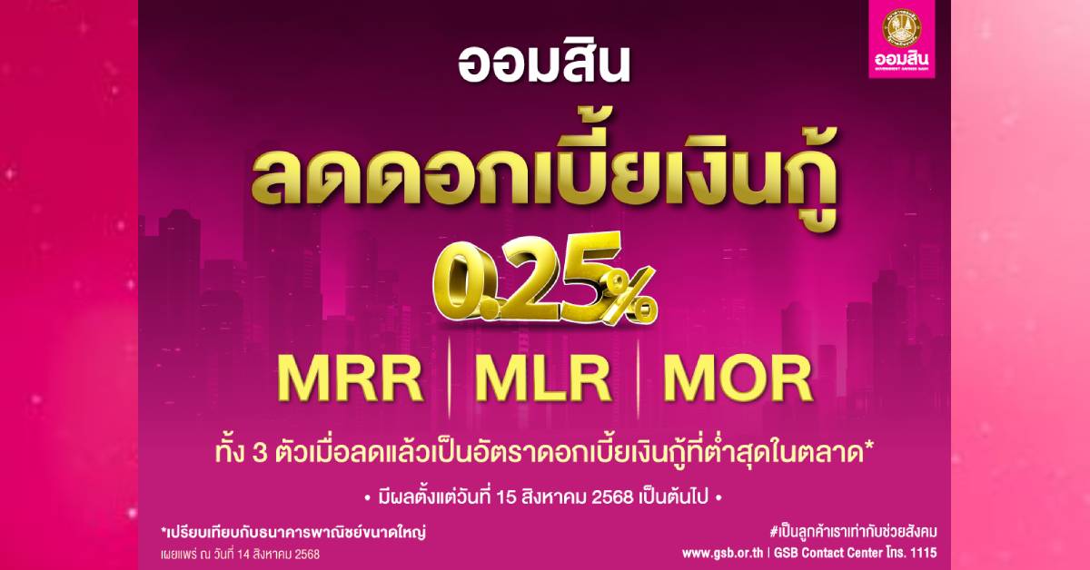 กรุงเทพฯ 14 ส.ค. – ออมสิน ประกาศลดดอกเบี้ยเงินกู้ทุกตัว 0.25% ทั้ง MRR, MLR และ MOR มีผล 15 สิงหาคม 68 หวังช่วยกระตุ้นเศรษฐกิจทั้งระบบ