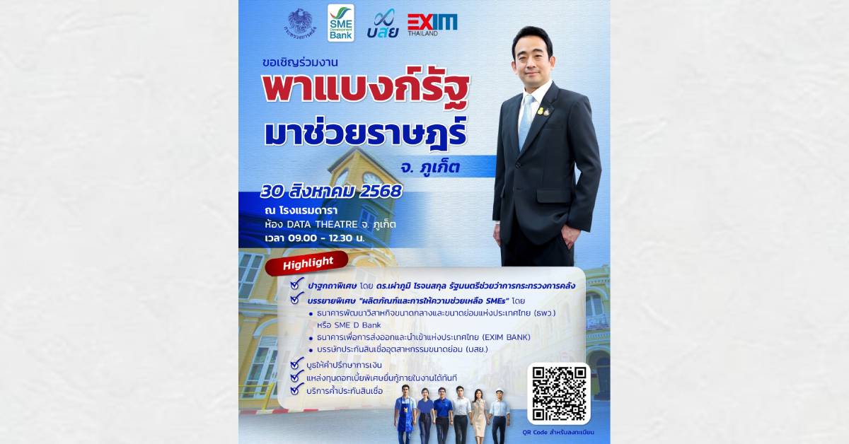 3 สถาบันการเงินเฉพาะกิจของรัฐ ภายใต้กำกับกระทรวงการคลัง ได้แก่ ธนาคารพัฒนาวิสาหกิจขนาดกลางและขนาดย่อมแห่งประเทศไทย (ธพว.) หรือ SME D Bank ธนาคารเพื่อการส่งออกและนำเข้าแห่งประเทศไทย (EXIM BANK) และ บรรษัทประกันสินเชื่ออุตสาหกรรมขนาดย่อม (บสย.) ประสานพลัง ขับเคลื่อนนโยบายรัฐบาล และกระตุ้นเศรษฐกิจภายในประเทศ จัดโครงการ “พาแบงก์รัฐ มาช่วยราษฎร์” นำบริการจาก 3 หน่วยงานมาสนับสนุนผู้ประกอบการเอสเอ็มอี จ.ภูเก็ต และใกล้เคียง ถึงพื้นที่อย่างครบถ้วนในจุดเดียว ในวันที่ 30 สิงหาคม 2568 เวลา 09.00-12.30 น. ณ ห้อง DATA THEATRE โรงแรมดารา จ.ภูเก็ต