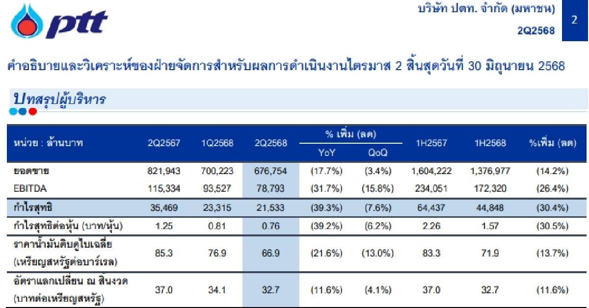 บมจ.ปตท. แจ้งตลาดหลักทรัพย์ฯ ว่า ในไตรมาส 2/68 ปตท.และบริษัทย่อยมีกำไรจากการดำเนินงานก่อนค่าเสื่อมราคาและค่าตัดจำหน่าย ต้นทุนทางการเงิน และภาษีเงินได้ (EBITDA) จำนวน 78,793 ล้านบาท ลดลง 36,541 ล้านบาท หรือ 31.7% จากไตรมาส 2/67 ที่มีจำนวน 115,334 ล้านบาท มีกำไรสุทธิ 21,533 ล้านบาท ลดลง 39.3% มียอดขาย 676,754 ล้านบาท ลดลง 17.7%