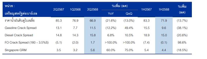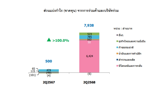 สำหรับผลประกอบการไตรมาส 2/68 ที่ลดลง สาเหตุหลักมาจากการดำเนินงานที่ลดลงของกลุ่มธุรกิจ ต่างๆ ดังนี้กลุ่มธุรกิจสำรวจและผลิตปิโตรเลียม ผลการดำเนินงานลดลงจากราคาขายและปริมาณขายเฉลี่ยลดลง รวมถึงค่าใช้จ่ายในการดำเนินงานเพิ่มขึ้น ประกอบกับ กลุ่มธุรกิจปิโตรเคมีและการกลั่นมีผลการดำเนินงานลดลง โดยธุรกิจการกลั่น ผลการดำเนินงานลดลงเนื่องจากไตรมาสนี้มีผลขาดทุนจากสต็อกน้ำมันสุทธิและมูลค่าสุทธิที่จะได้รับของสินค้าคงเหลือ โดยในไตรมาส 2/68 ขาดทุนประมาณ 7,200 ล้านบาท ขณะที่ในไตรมาส 2/67 กำไรประมาณ 2,800 ล้านบาท แม้ว่ากำไรขั้นต้นจากการกลั่น (Market GRM) และปริมาณขายเพิ่มขึ้น ขณะที่ธุรกิจปิโตรเคมี ผลการดำเนินงานลดลงจากส่วนต่างราคาผลิตภัณฑ์กับวัตถุดิบของกลุ่มอะโรเมติกส์และโอเลฟินส์ที่ปรับตัวลดลง